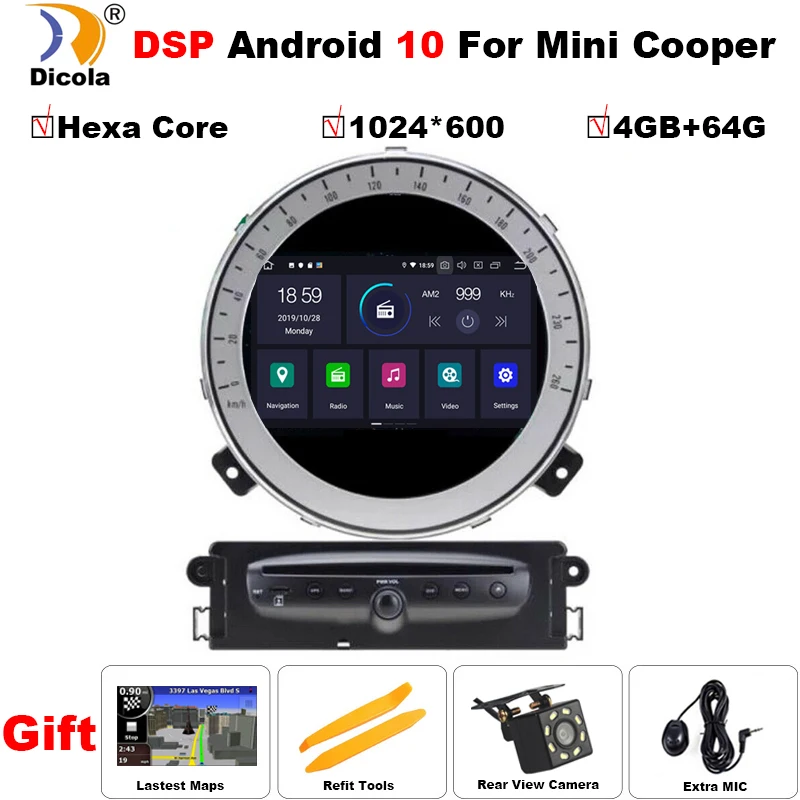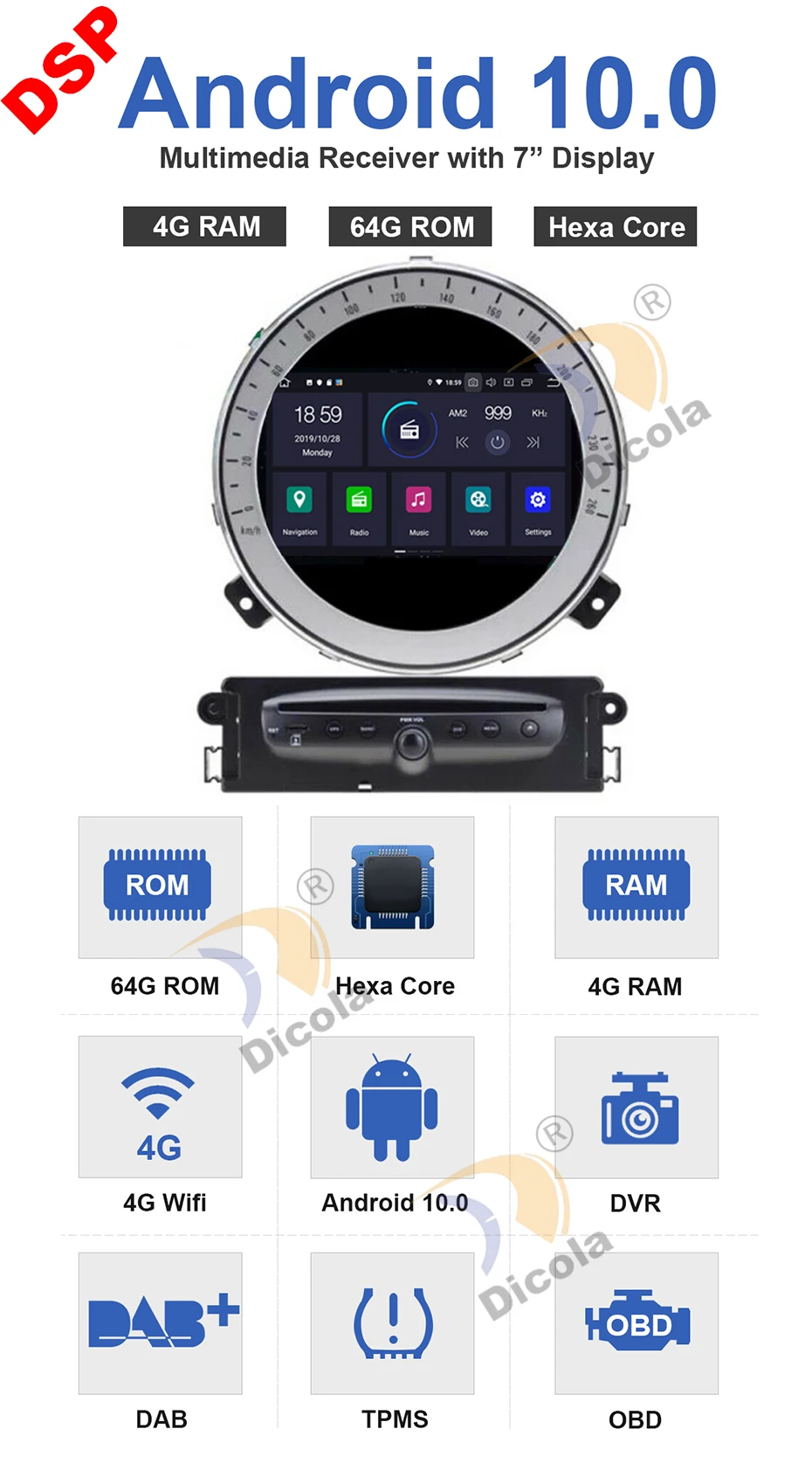 Чистый Android 10!DSP!7Дюймовый автомобильный dvd-плеер для BMW Mini Cooper с управлением на рулевое колесо +Шестиядерный процессор+4 Гб оперативной памяти+64 Гб ROM+1024*600 IPSЭкран + емкостный экран + Wifi +3G/4G(3G/4G ключ опционально)+ Gps-навигация +IPhone/Android мобильный телефон зеркальная ссылка+ Bluetooth 5,0 (A2DP/Телефонная книга) + FM/AM + RDS +Видеорегистратор (опционально)+OBD II (опционально)+1080P Vedio Play+DAB (опционально)+Автомобильная игра (опционально)+Дополнительный микрофон+Бесплатная карта+Камера заднего вида+Инструменты для ремонта