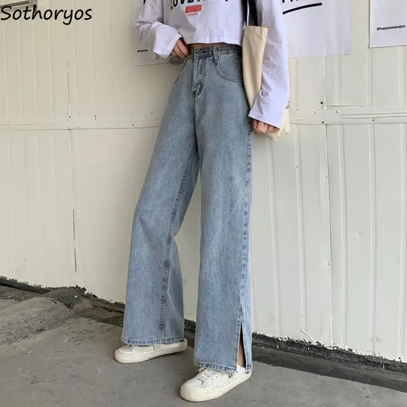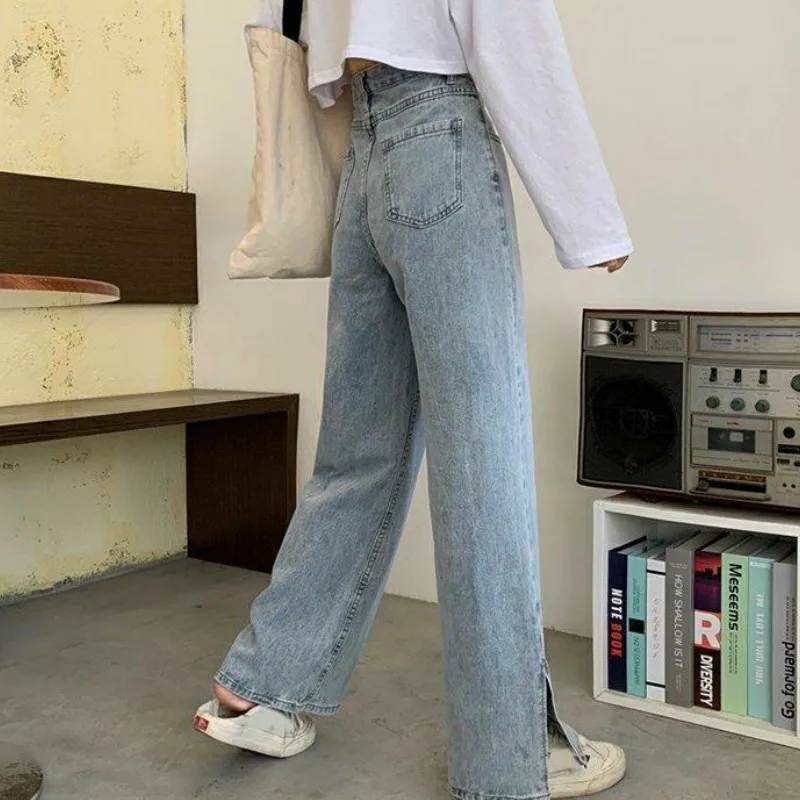 Женские джинсы с широкими штанинами и Боковым Разрезом, однотонные винтажные простые уличные брюки с эффектом потертости и высокой талией, Стильные повседневные брюки Ulzzang