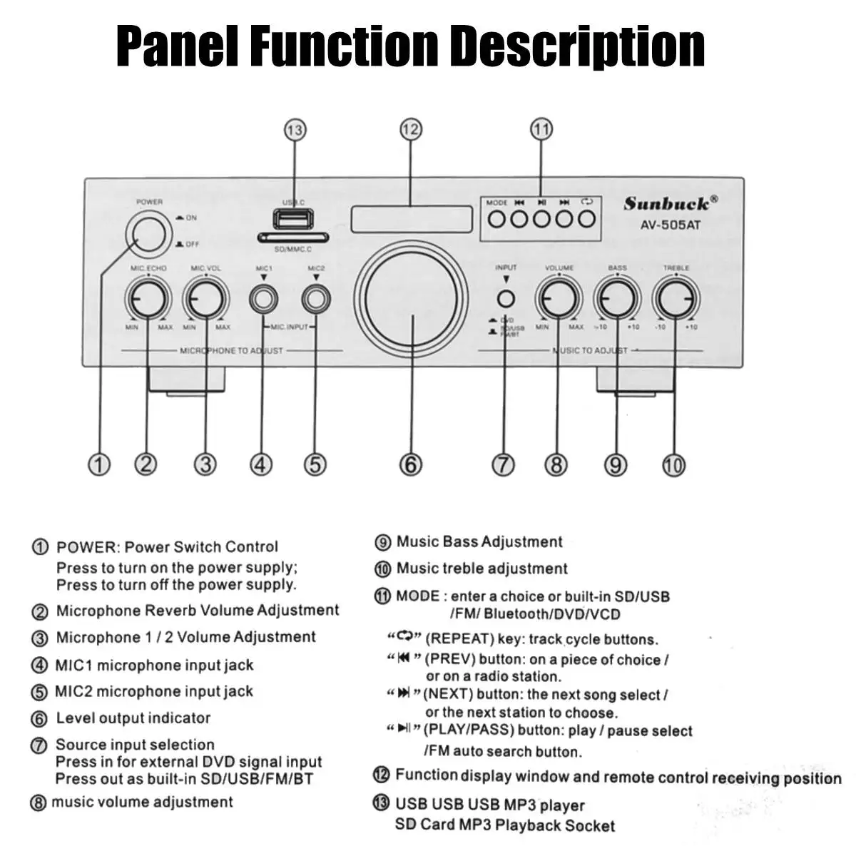 4. Двухсторонний вход для микрофона караоке, функция регулировки цифрового эффекта реверберации.
