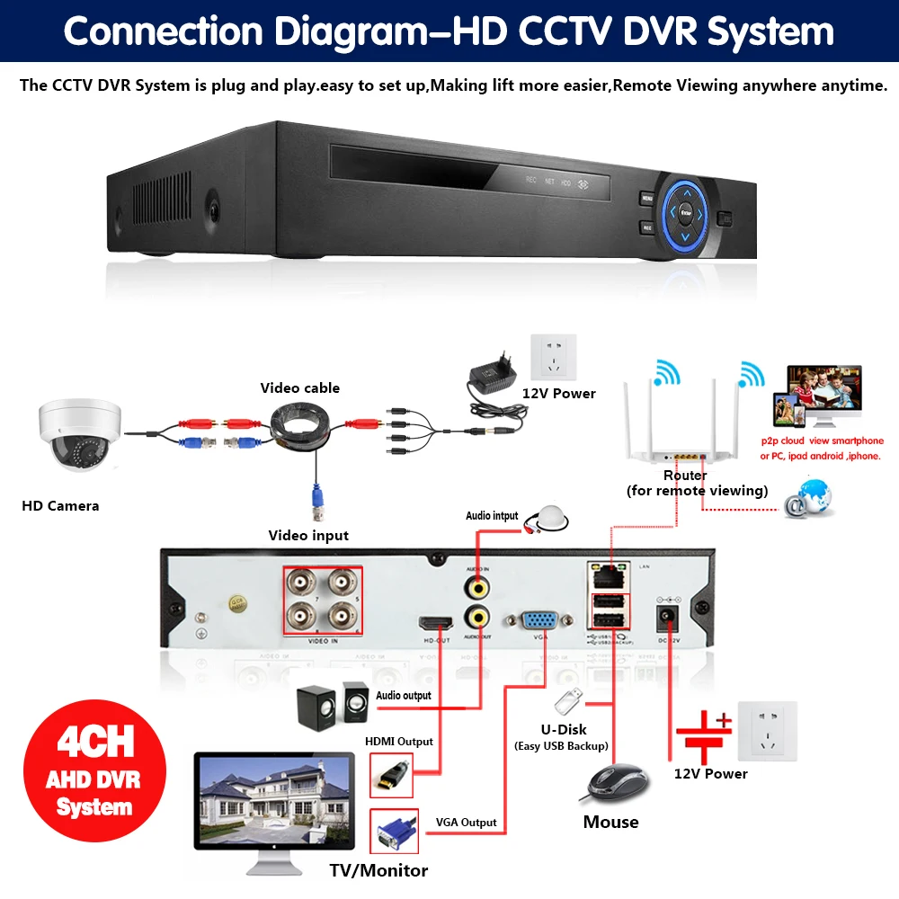 Простая настройка, всего 4 шага для просмотра на мобильный телефон,Просмотр видео в режиме реального времени в системе из любого места и в любое время с помощью смартфона, стола или ПК с передовой технологией P2P, вы можете получить удаленный доступ к вашей системе в течение нескольких минут или меньше, нет необходимости в переадресации, удаленный доступ никогда не был таким простым!