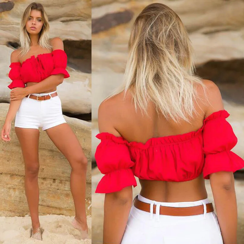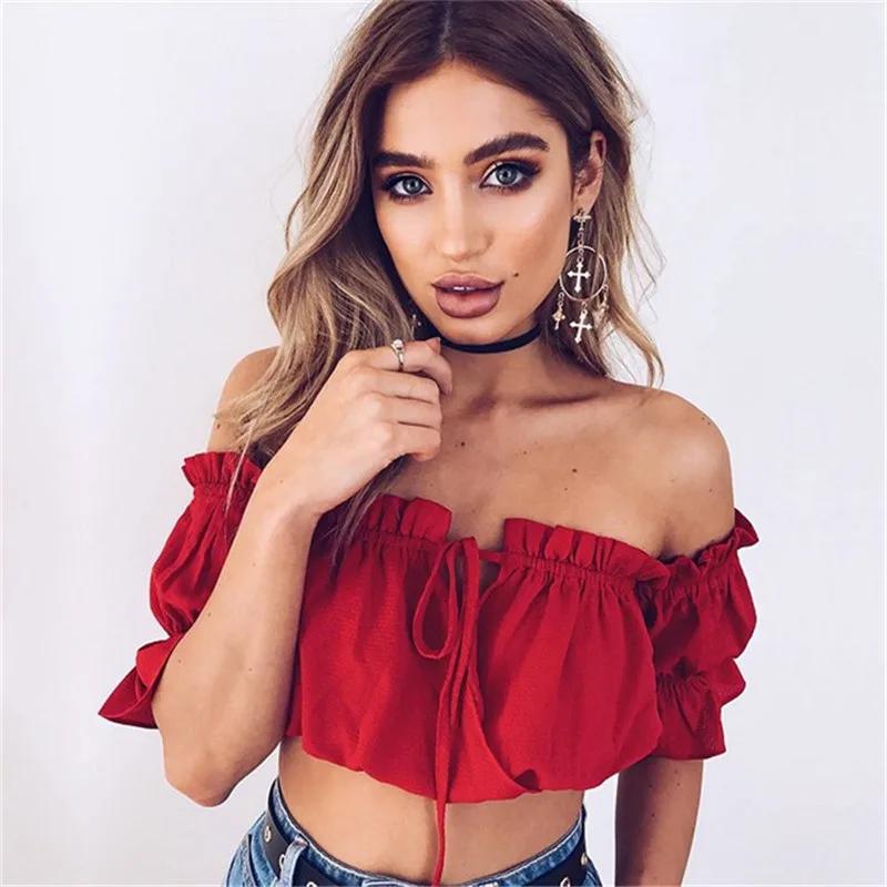 Модная пикантная женская шифоновая блузка с длинным пышным рукавом, укороченный топ с открытыми плечами, блузка с коротким рукавом, Свободная Повседневная блузка, Женская Сексуальная рубашка