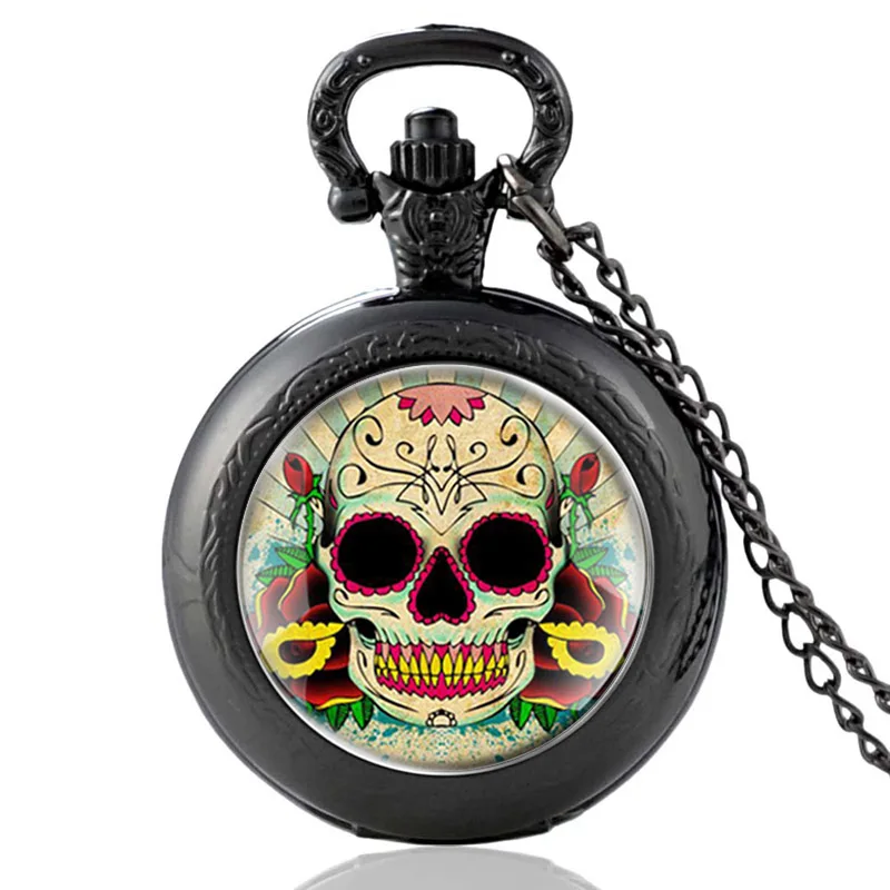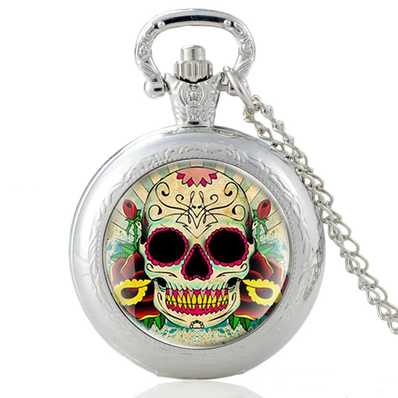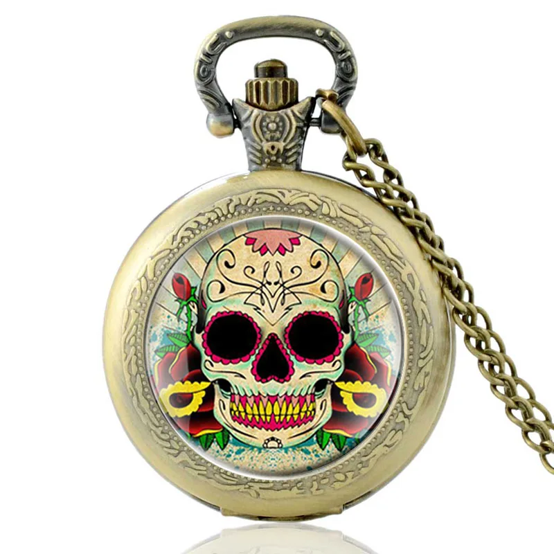 Античный бронзовый череп, цветочный дизайн, стеклянный кабошон, кварцевые карманные часы, Винтажный Мужской и женский кулон, ожерелье, цепные часы