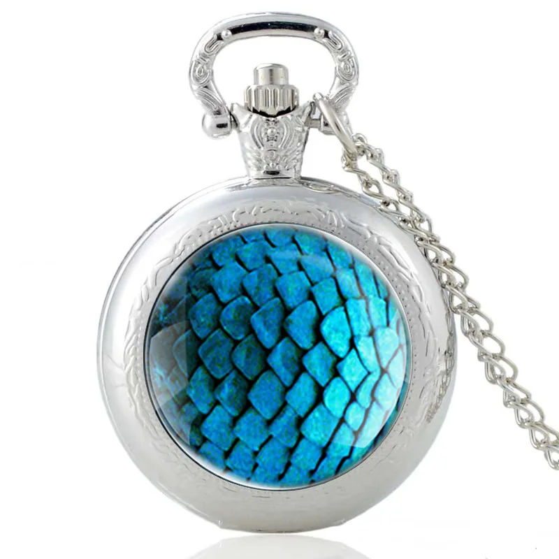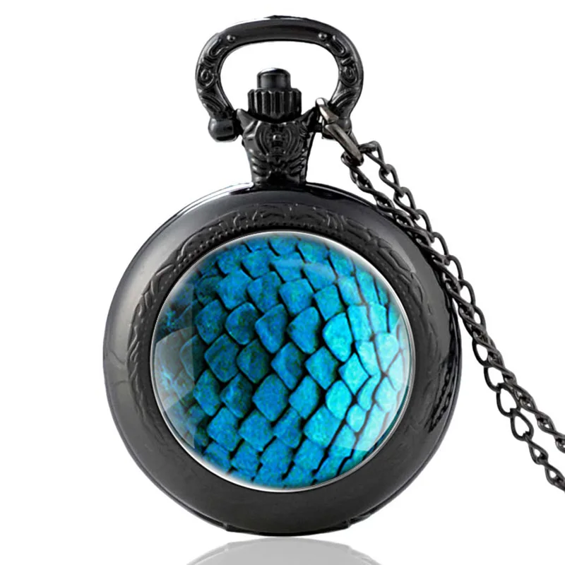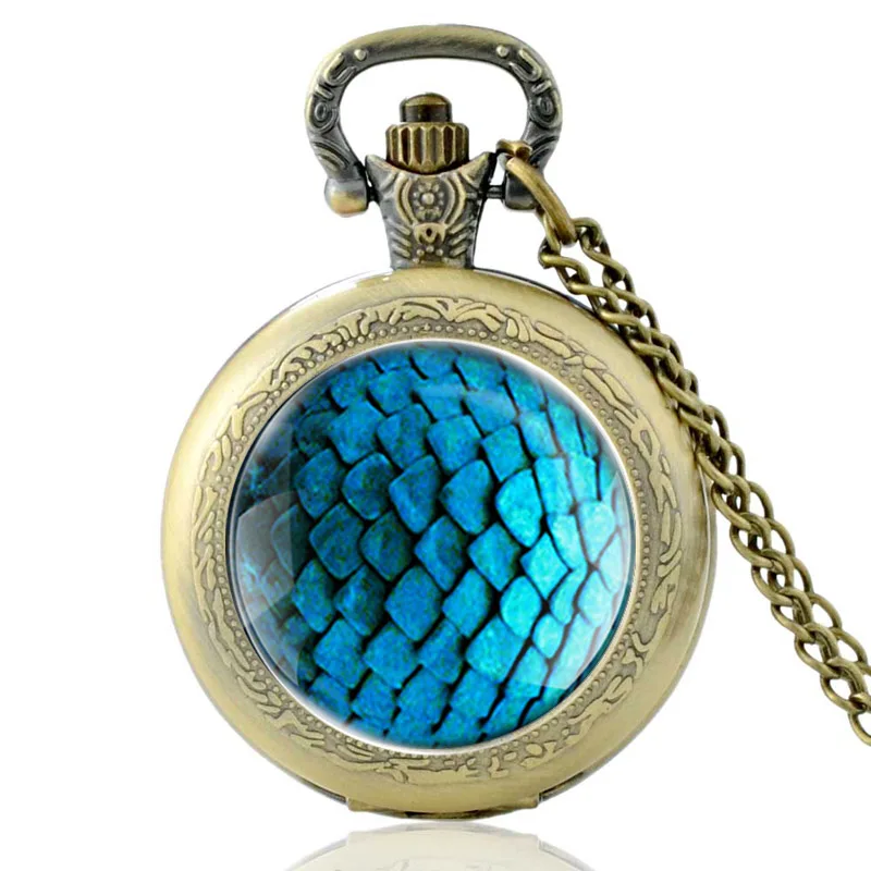 Уникальные дизайнерские кварцевые карманные часы с голубым драконом и стеклянным кабошоном, винтажные мужские и женские часы с кулоном и цепочкой с ожерельем