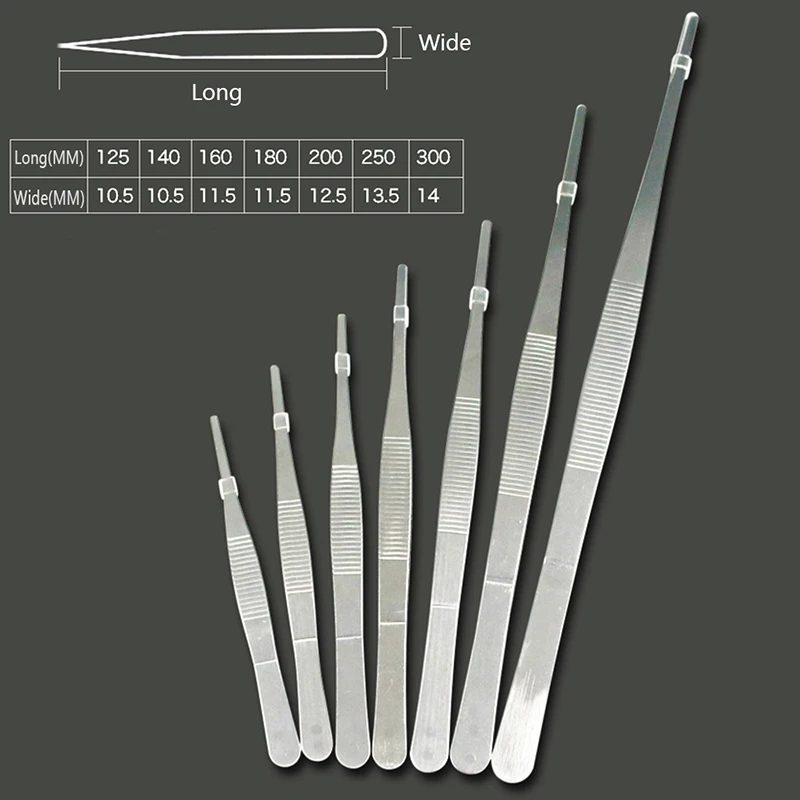 Пинцет с острым наконечником: 125*10,5 мм/140*10,5 мм/160*11,5 мм/180*11,5 мм/200*12,5 мм/250*13,5 мм/300*14 ммПинцет с изогнутыми наконечниками: 120*10,5 мм/135*10,5 мм/155*11,5 мм/175*11,5 мм/195*12,5 мм/245*13,5 мм/295*14 ммМатериал: нержавеющая стальЦвет: серебристыйКоличество: 2 шт.