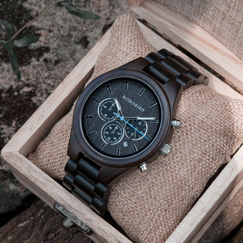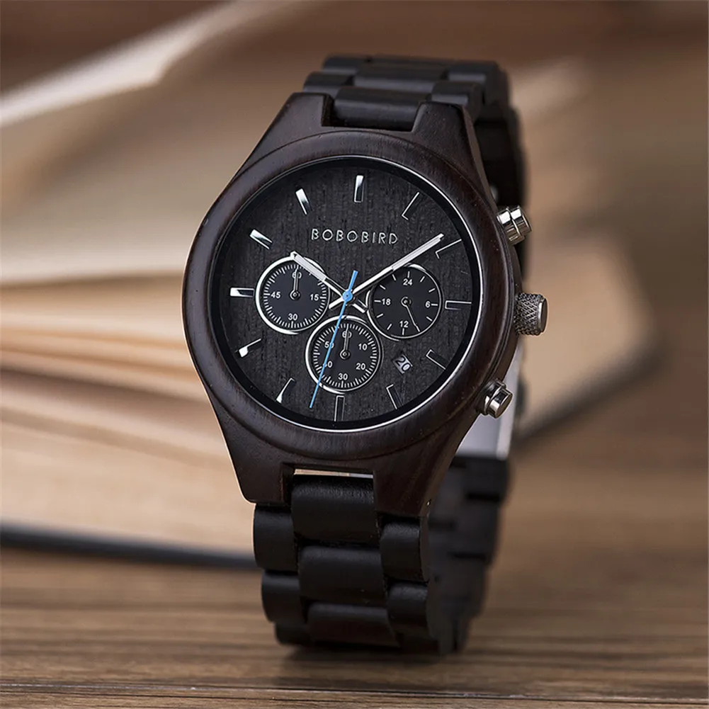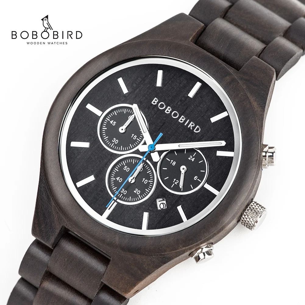 Часы наручные BOBO BIRD мужские с хронографом, люксовые брендовые Кварцевые Светящиеся, с деревянным ремешком из черного дерева