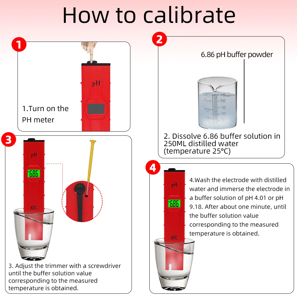 Вы можете просто следовать инструкции на предоставленной упаковке раствора 4.00or 6,86, погрузите тестер PH в раствор и отрегулируйте с помощью предоставленной отвертки, чтобы набрать его.