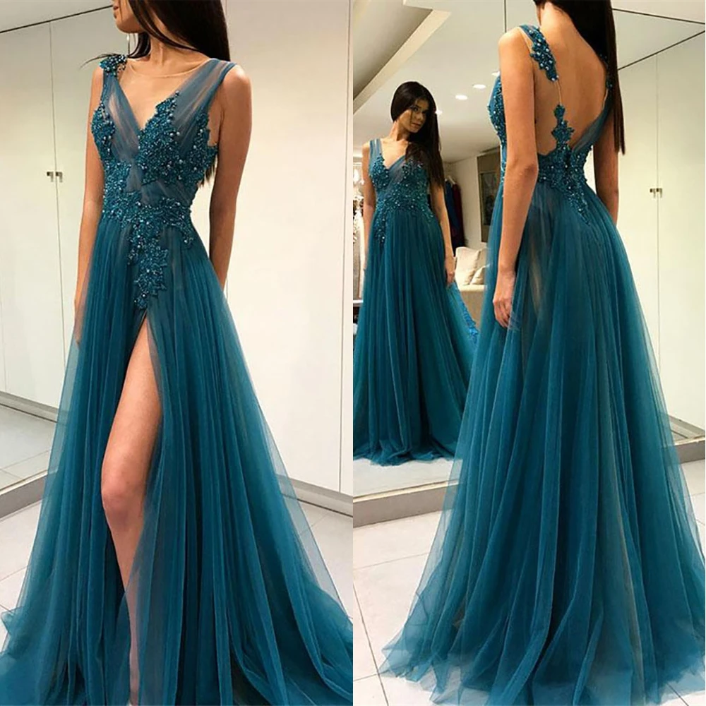 Пикантные Разделение с v-образным вырезом, вечернее платье с апплик...