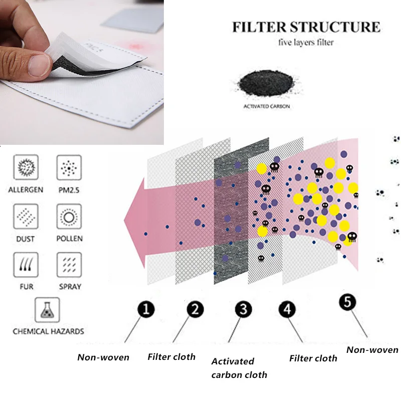 5 слоев для маски для лица, изготовлена из активированного угля и нетканого полотна. Эффективно изолирует до 99 процентов пыли, защитит рот и лицо от пыли, дымки, аллергии, дыма, загрязнений, золы, пыльцы, опасных химических веществ. Пожалуйста, обратите внимание, что перечисленный продукт производится и распространяется за границей и в соответствии с законодательством страны происхождения.