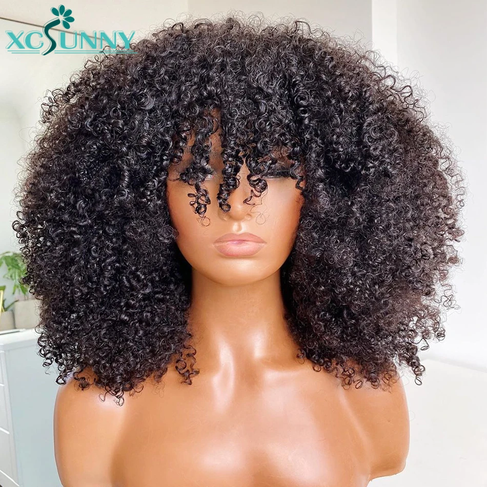Афро кудрявый парик с челкой полностью машинная работа верхний парик 200 плотность Remy Бразильские короткие кудрявые человеческие волосы парики Xcsunny