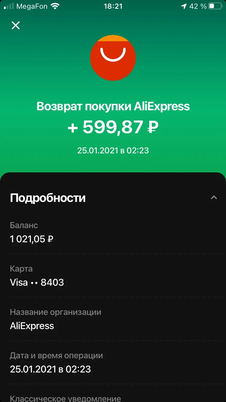 Я просто в шоке! 11.11.2020 делала заказ, оплатила! Мало того, что товар не пришёл , ещё и при открытии спора было решено вернуть деньги, НО!!! Вместо 670₽ вернули 599₽ (за минусом, типо скидки AliExpress) С другого заказа вообще снимают 200₽, т.е., сделав заказ во время акции(типо чёрной пятницы) можно остаться без заказа и части денег. Бессовестные ! Наживаются таким образом! Я в шоке!!!