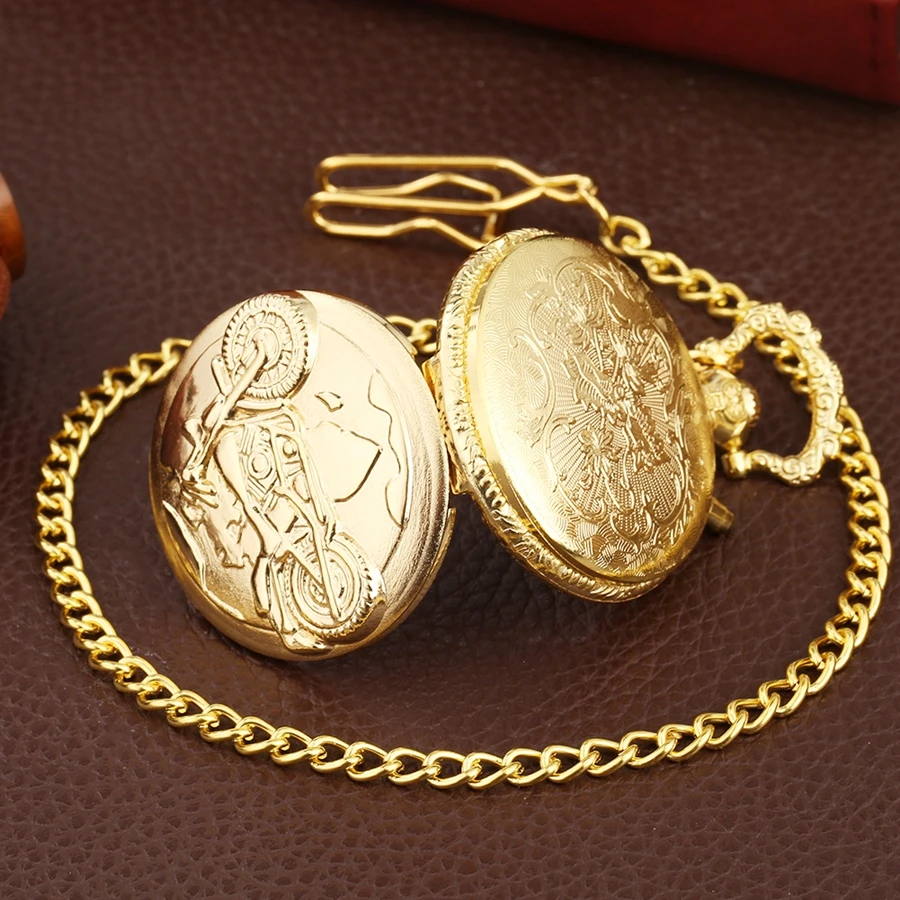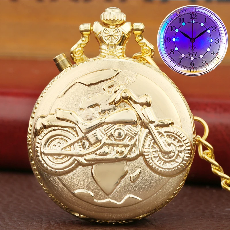 Роскошные золотистые светящиеся кварцевые карманные часы со светодиодным дисплеем, резьбовые часы на цепочке для мотоцикла, мотоцикла, фонарик, часы, подарки