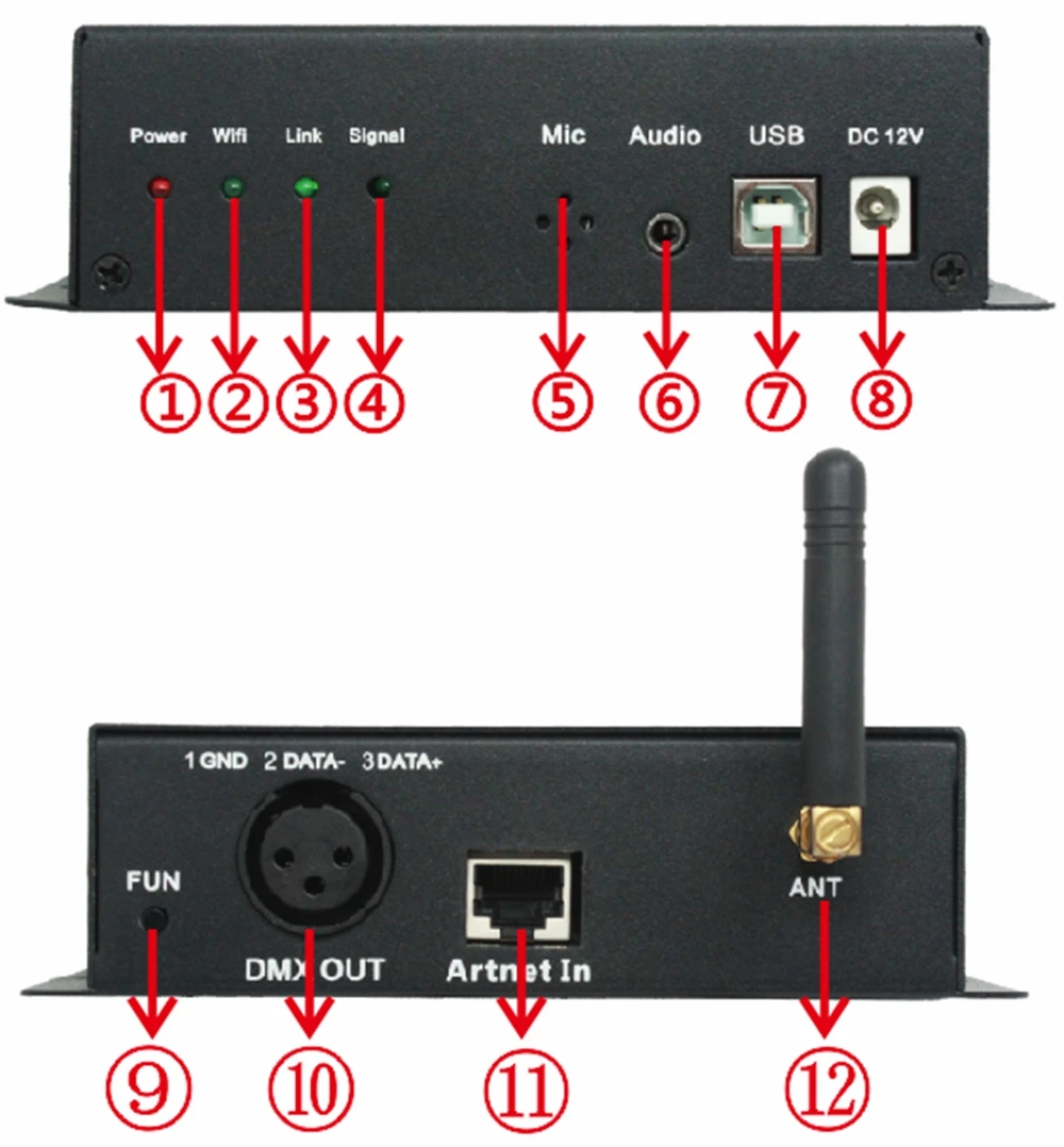 ① Мощность: светильник с индикатором питания, долгое время яркий показывает источник питания, как правило② WIFI: светильник индикатора сигнала WIFI, если беспроводная сеть не включена, она не будет гореть.③ Ссылка: сигнальная лампа для управления сотовым телефоном; Без операции часто тускнеет, мигание через мобильный телефон.④ Сигнал: Состояние Протокола (долгое время off-DMX512 протокол, долгое время яркий-протокол ArtNet)Кнопочный переключатель (в соответствии с Протоколом DMX512, светодиодная вспышка означает успех переключателя)⑤ Микрофон: Встроенный аудио вход, когда не подключается внешний аудио, он будет работать.Audio аудио: внешнее аудио соединениеUSB: интерфейс USB, используется во время обновления версииDC12V DC12V: входной источник питанияFUN: кнопка (короткое нажатие 1s): переключатель режима контроллера (только может поддерживать протокол DMX512, светодиодную вспышку). Режим включает 8 статических сцен, 6 динамических сцен и Голосовое управление, всего 15 режимов; (Длительное нажатие 3s) переключение протоколов может быть переключено на протокол DMX512 и режим ART-NET (для получения информации ART-NET в режиме маршрутизации); Часто нажмите 5 секунд, чтобы восстановить заводские настройки.OUT DMX выход: выход сигнала DMX.⑪ Artnet в: порт входного сигнала Art-net.⑫ ANT : WIFI антенна.