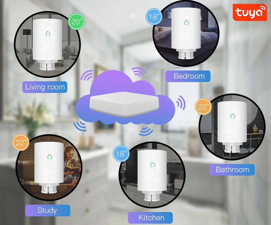 Управляйте больше с помощью одного беспроводного концентратораПоддерживает один шлюз ZigBee Hub для управления максимум 50 клапановГостиная | Спальня | Ванная комната | Кухня | Sutdy