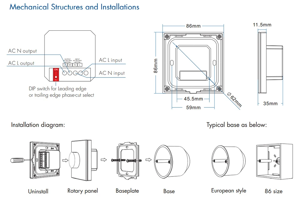 ● Для приглушения и переключения одноцветных диммирусветодиодный ных ламп, традиционных ламп накаливания и галогенных ламп.