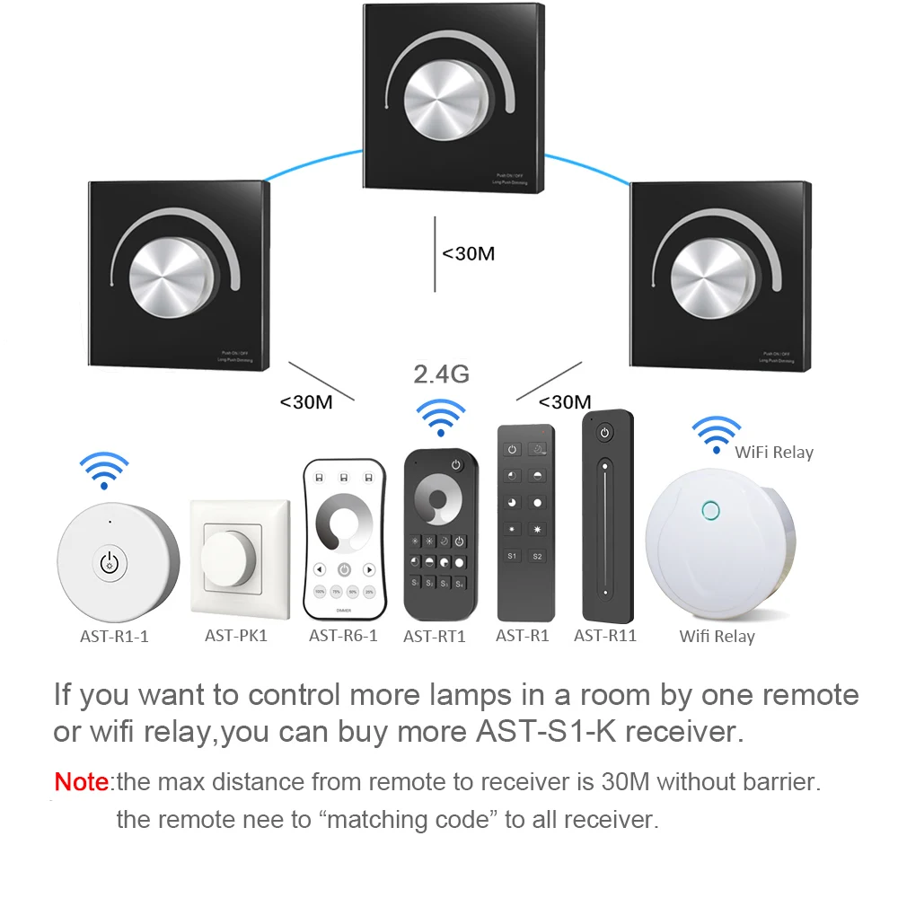 Если вы хотите управлять большим количеством ламп с помощью одного пульта, вам нужно купить больше приемника(AST-S1-K). Только делать"Код соответствия"Между отправителем и приемниками перед использованием.