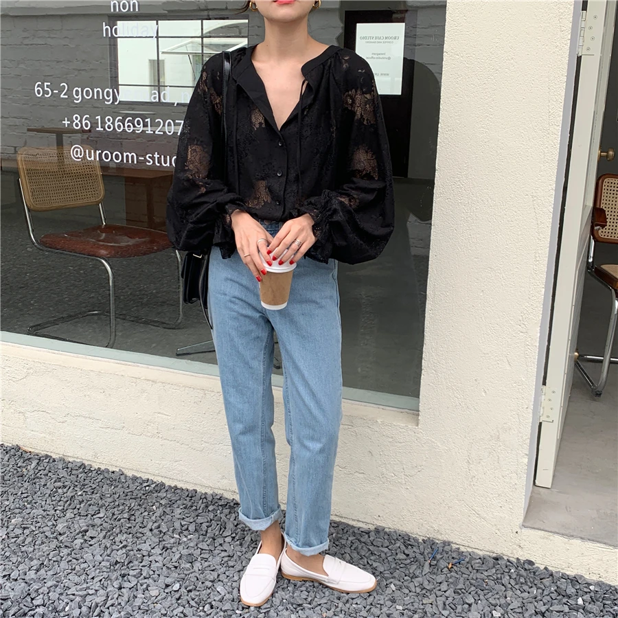 Женская Кружевная блуза с длинным рукавом-фонариком, свободного покроя