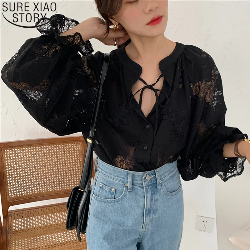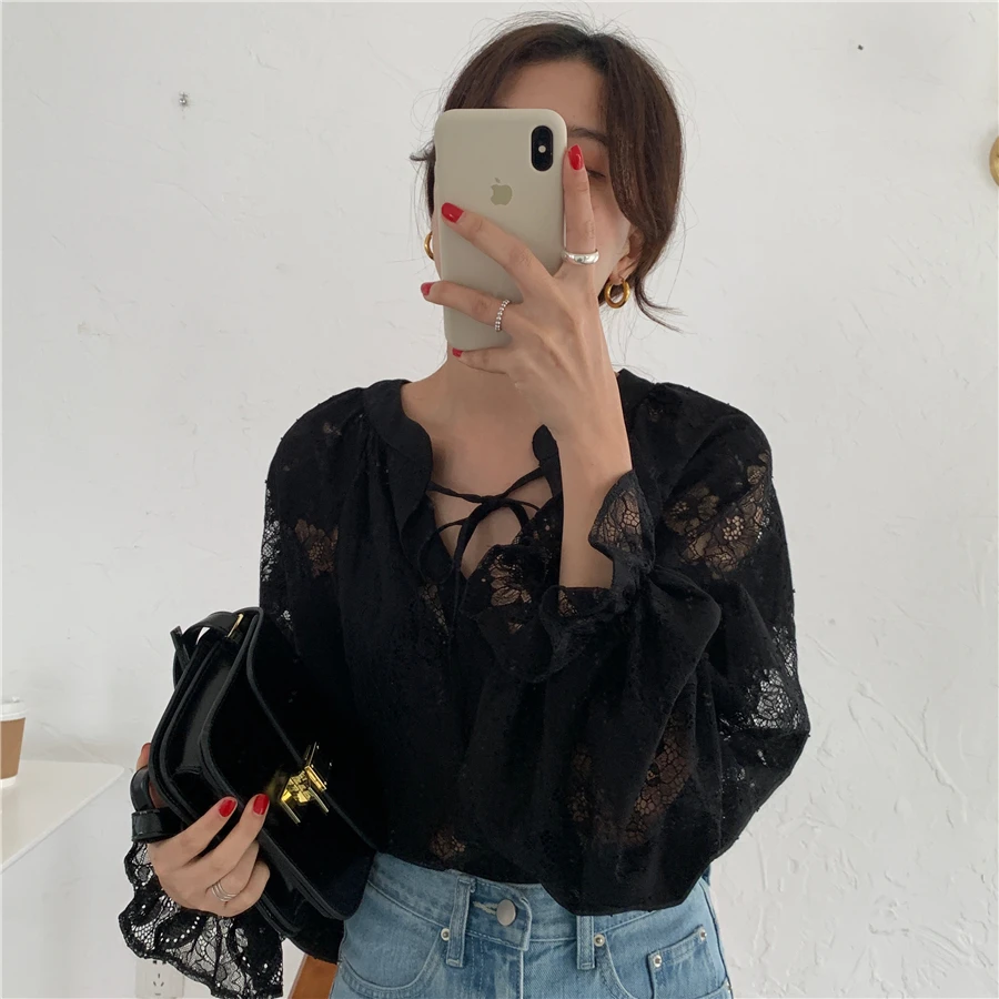 Женская кружевная блузка, прозрачная блузка с длинным рукавом-фонар...