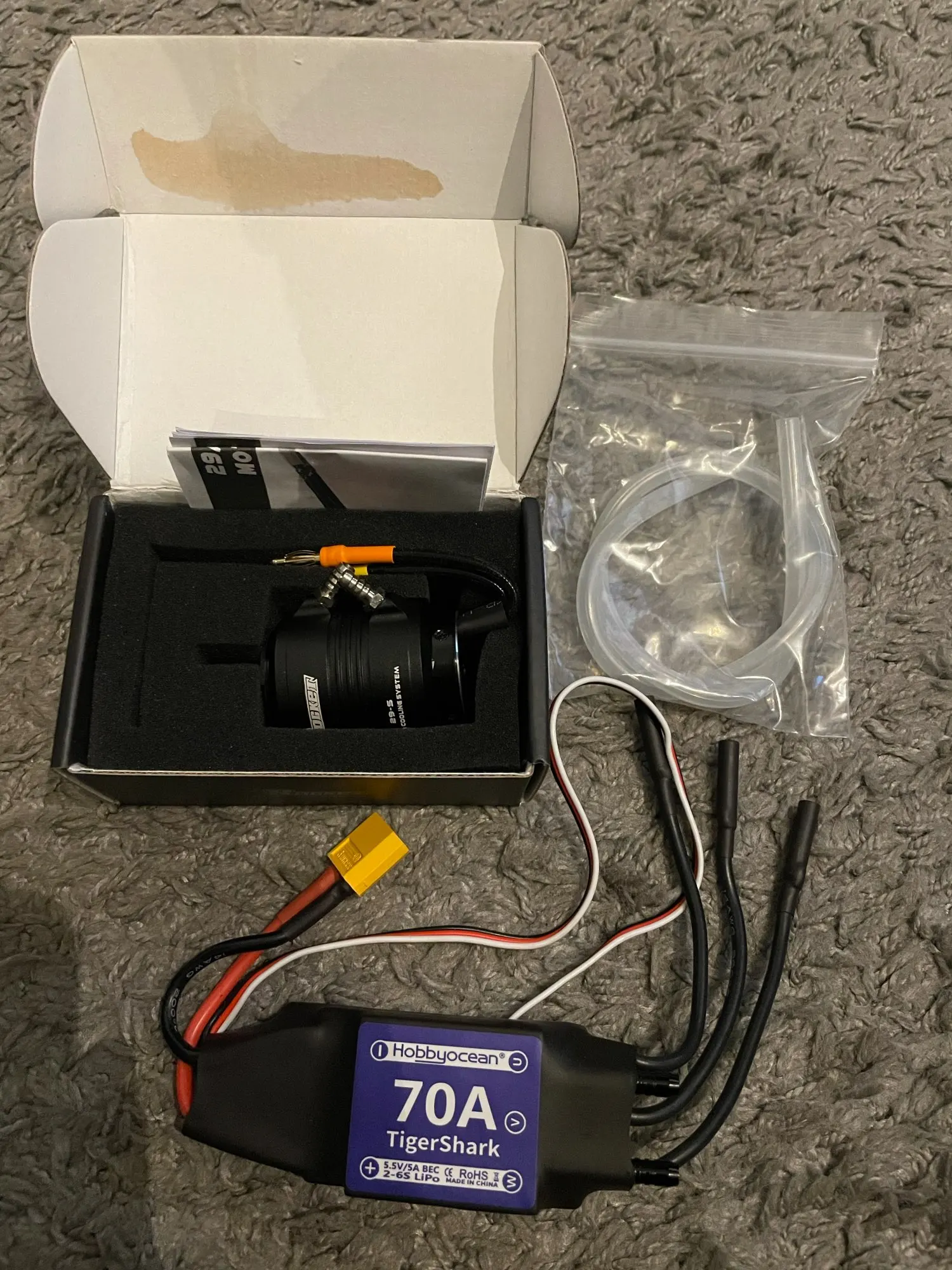 Доставка и впрямь очень быстрая! Всё выглядет качественно и красиво. Однако регуль весит 130 грамм, что более чем вдвое выше указанного в описании. Кому надо, мотор, вместе с рубашкой охлаждения весит 146 грамм.
