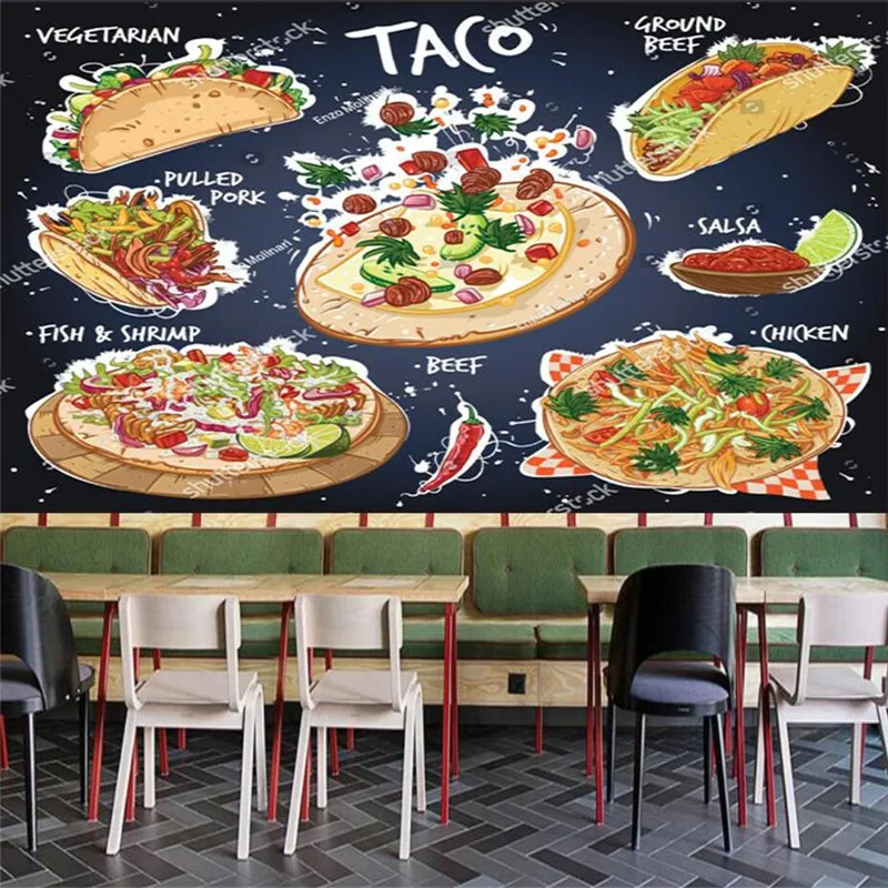 Ручная роспись пиццы Тако салат Фастфуд Ресторан промышленное украшение 3D обои снек бар обои Papel де Parede