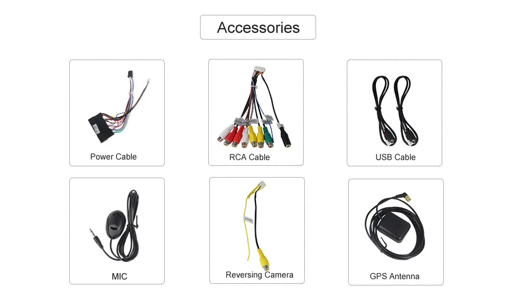 Один кабель RCA с внешним входом микрофона, один кабель камеры заднего вида с Wi-Fi и сигнальными кабелями BT, один антенный кабель GPS, два usb-кабеля, один установочный инструмент, один внешний микрофон
