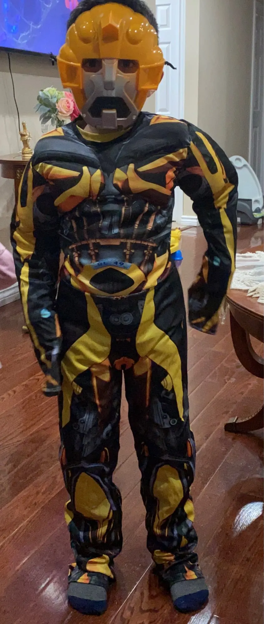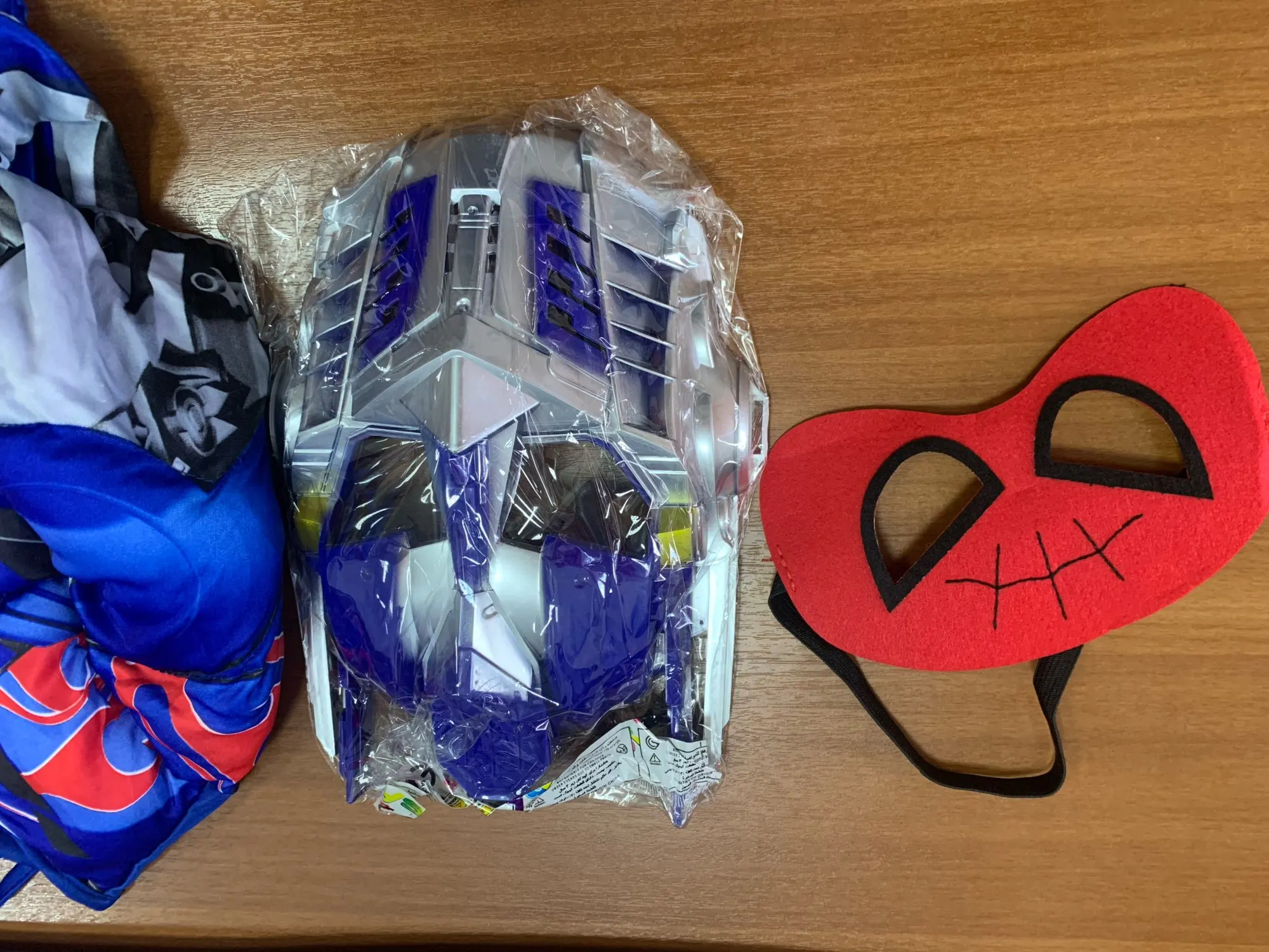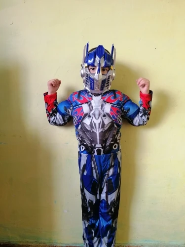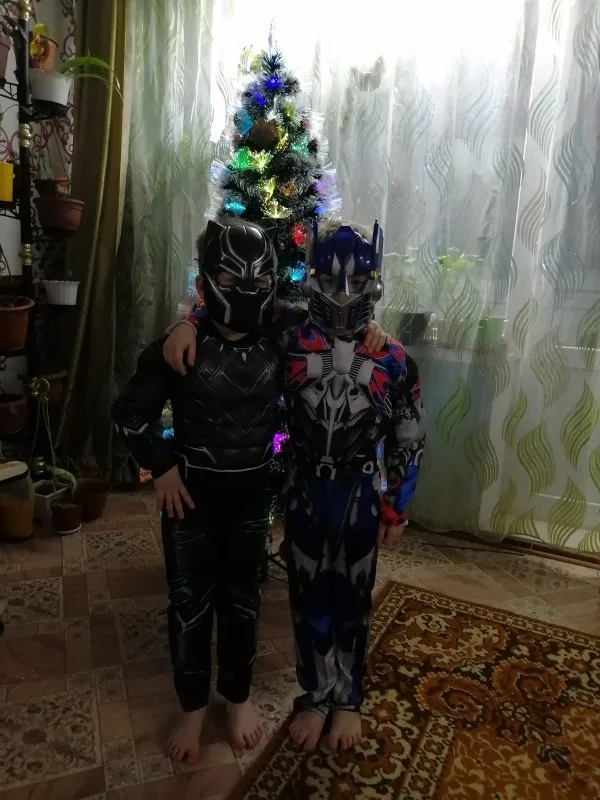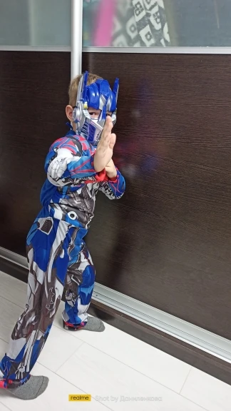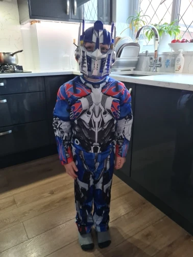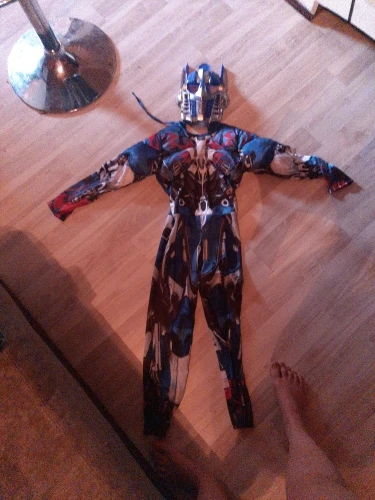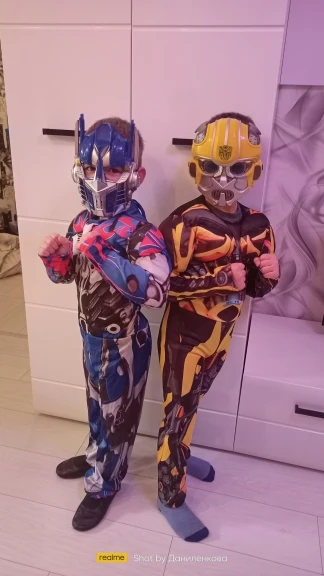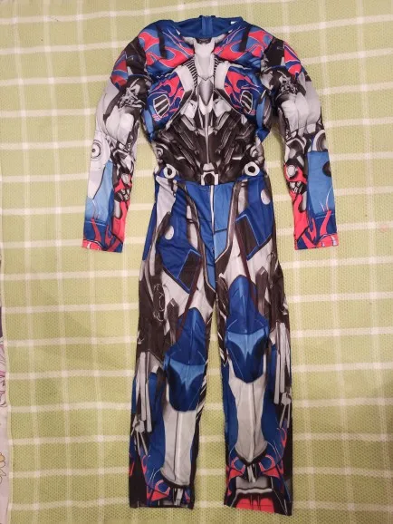 Красивый костюм трансформеры Оптимуса Прайма. На 5 лет (рост 110см) большой, нужно подлаживать рукова и штаны. Костюма ткань синтетика, маска не повреждена. Больше спасибо за подарочек маску человека- паука. Спасибо хороший костюм, только большемерят.