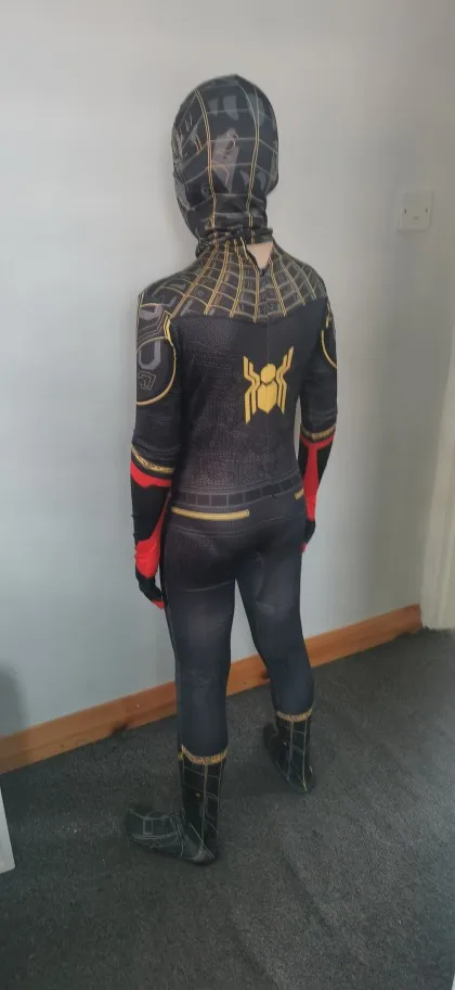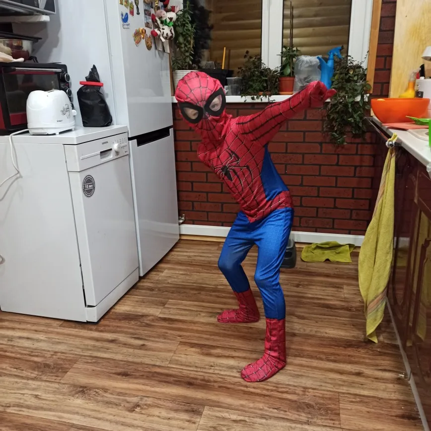 Костюм супер,тоненький.,на 5 лет S ку взяла, длинные рукава и штаны,на фото завернула во внутрь.Но это совсем не проблема ...РЕКОМЕНДУЮ.Яркий,необычный,ребенок счастлив.Спасибо продавцу за маску человека паука