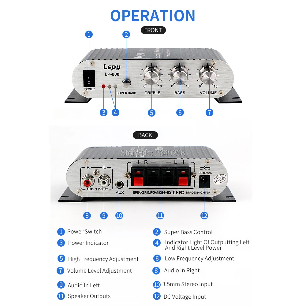 Благодаря регулировке компенсации низких частот три ручки управляют соответственно низкими частотами, высокими частотами и основной громкостью. Два гнезда Lotus на задней панели подключены к аудиовходу, разъем mp3 также подключен к аудиовходу, а четыре Кабельные зажима подключены к левому и правому каналам динамика.