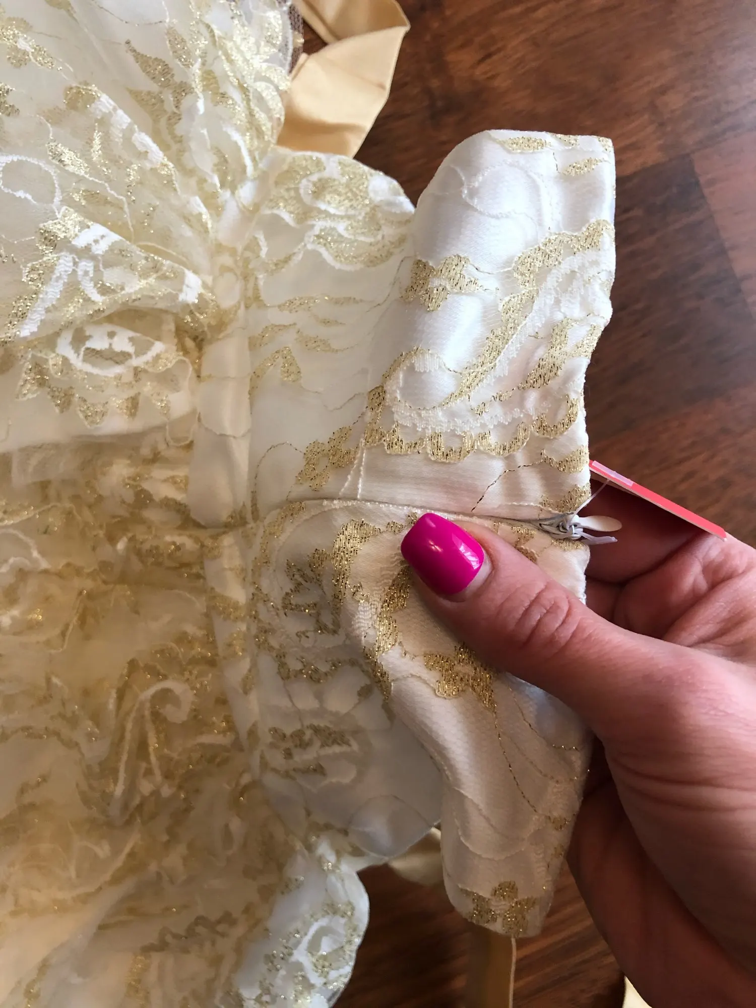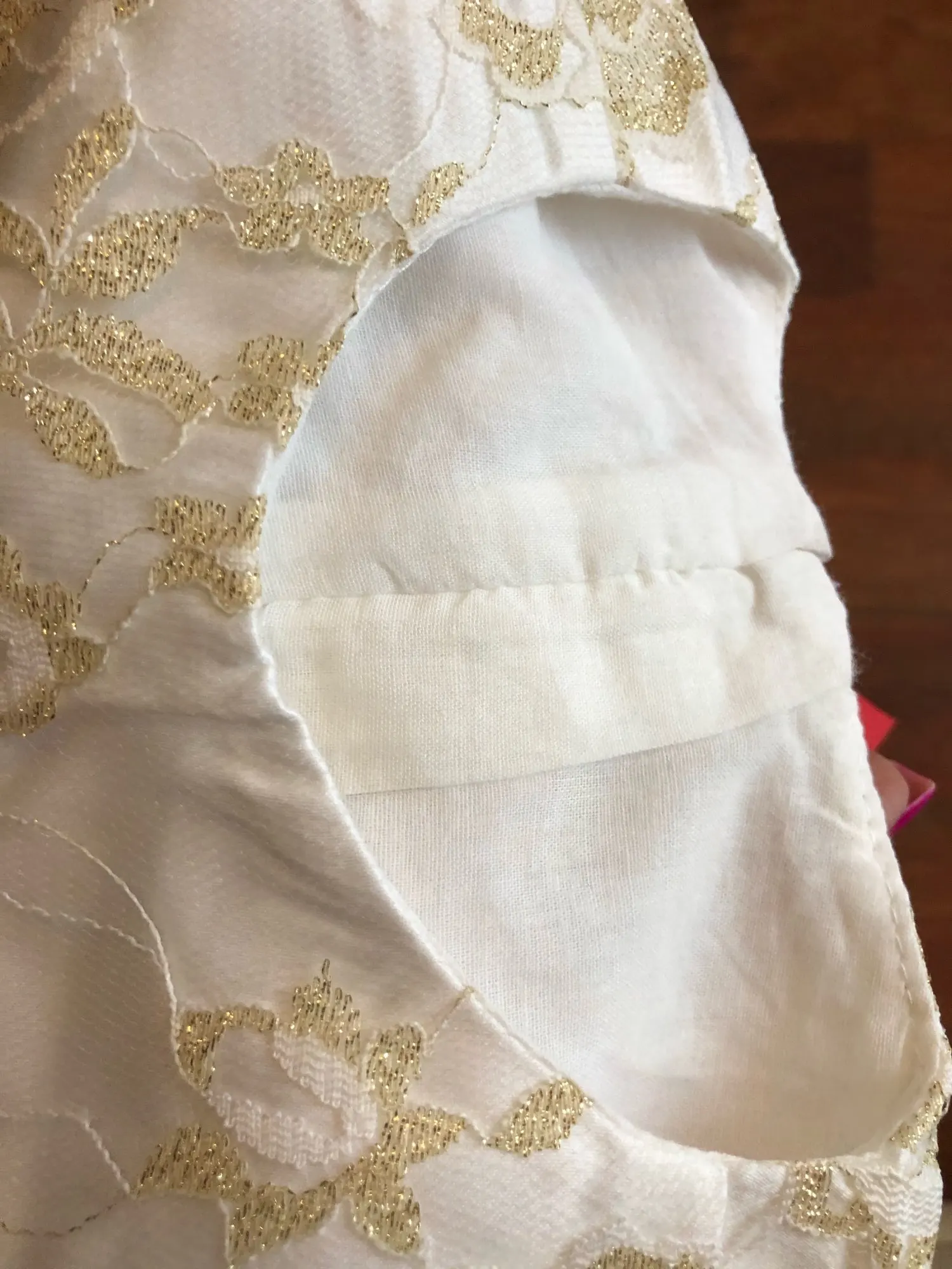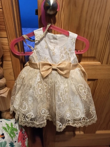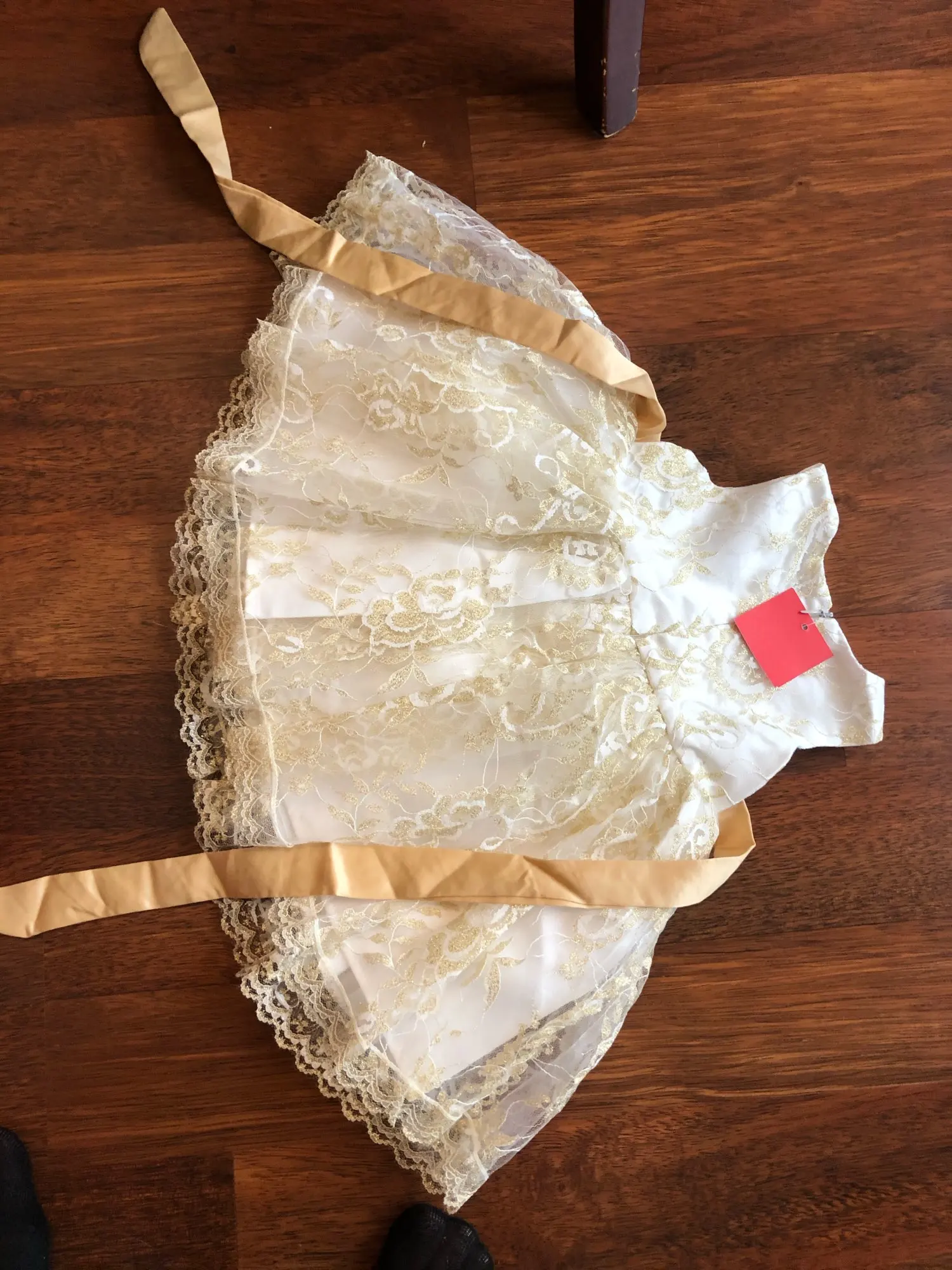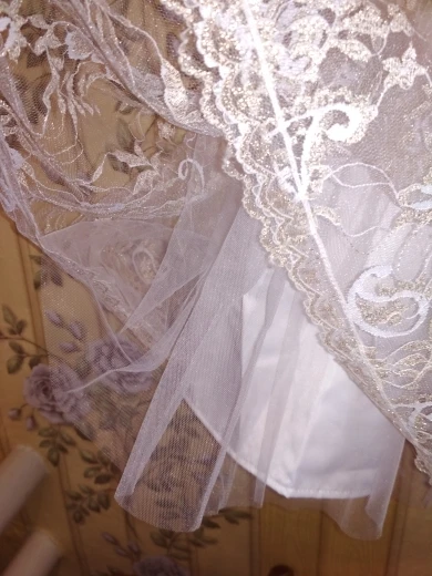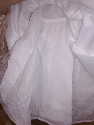 Платье красивое, но пришло с оборванным местами кружевом по переду платья, продавец предложил его обрезать и возместил 600 р. Подклад хлопок. Машинную стирку при 40 градусах в мешке перенесло отлично. Брала специально больше размер, не люблю когда талия под грудью, на рост 70 село как надо, талия совпала, длинна до пола. Платье до юбки 20 см, юбка (до обрезания) - 35 см, ширина 29 см, т.е. соответствует таблице продавца по размеру 3т.