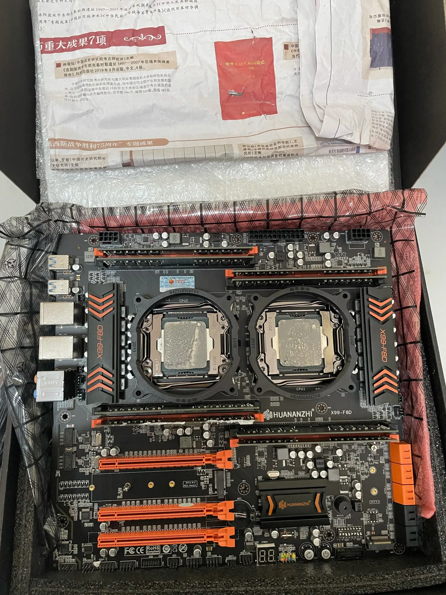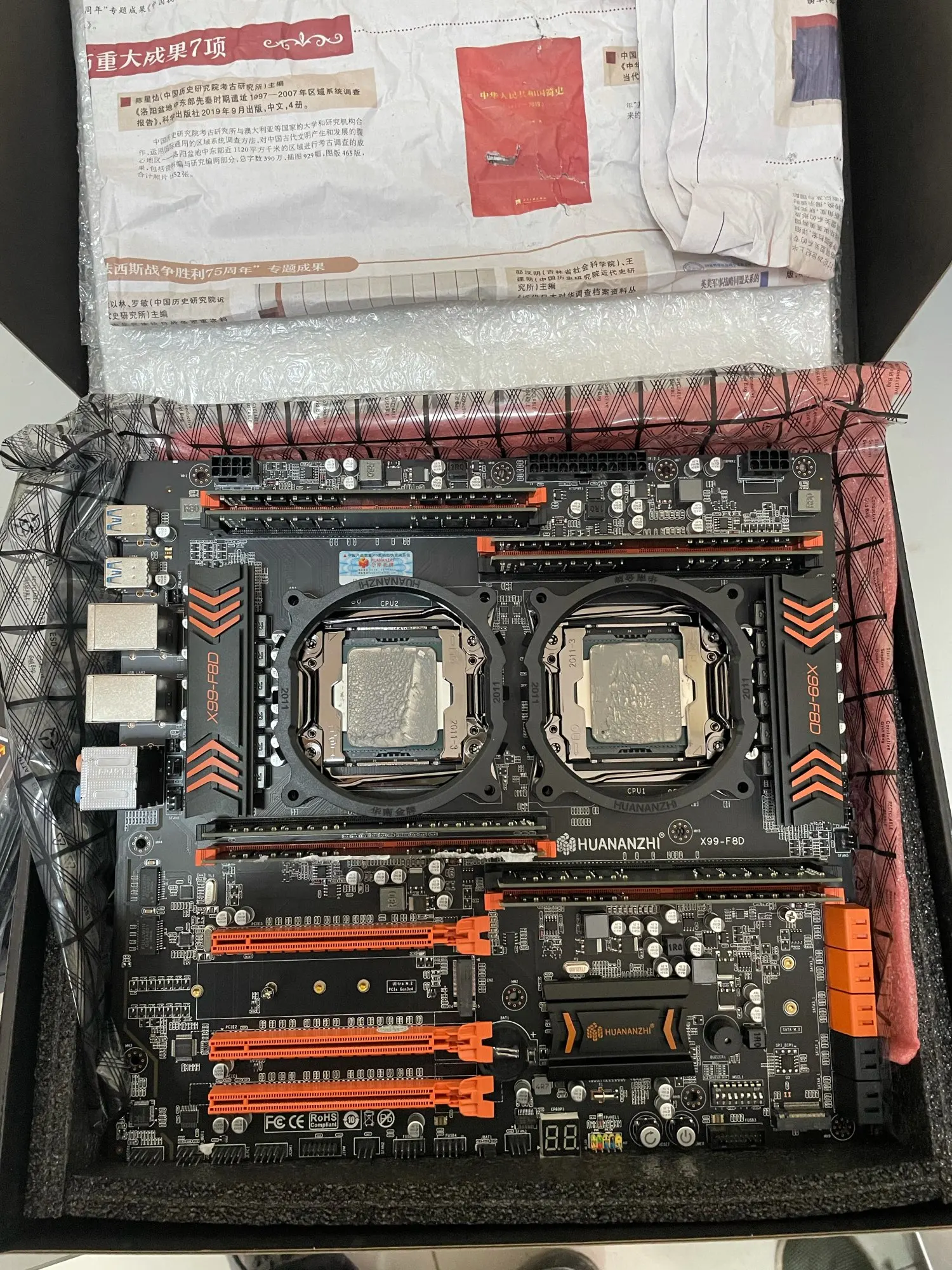 Ехало три недели без отслеживания. Запакована очень хорошо. Плата очень большая: обратите внимание на размеры, влезет не во все корпуса. При первом включении виснет на B7 (коды ошибок свои, не совпадают с брендованными х99) - надо передернуть Clear RTC джампер. Не поддерживает сон (при включении в биосе засыпает и не просыпается). Загружается очень долго. Пипиканье при запуске раздражает. В остальном очень, очень отличная плата. Рекомендую
