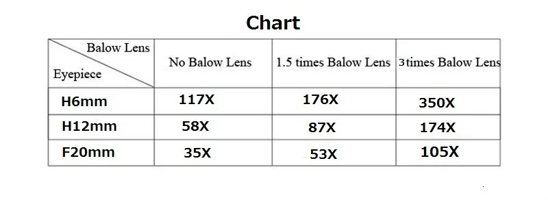 Окуляр h6 мм только = 700/6 = 117 раз. В сочетании с 3 раза Balow объектив = 117*3 = 350 раз. В сочетании с 1,5 раз эректор = 117*1,5 = 175 раз масштабирования прямое изображение.(Хорошо для астрономического наблюдения).