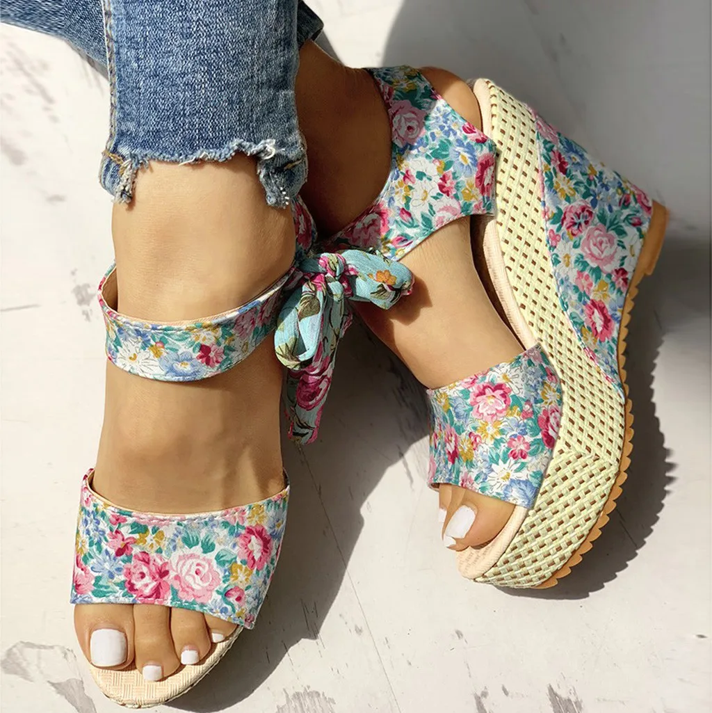 Сандалии женские в богемном стиле, босоножки с ремешком на щиколотке, на танкетке, на платформе, с бантом, Повседневная модная обувь с открытым носком