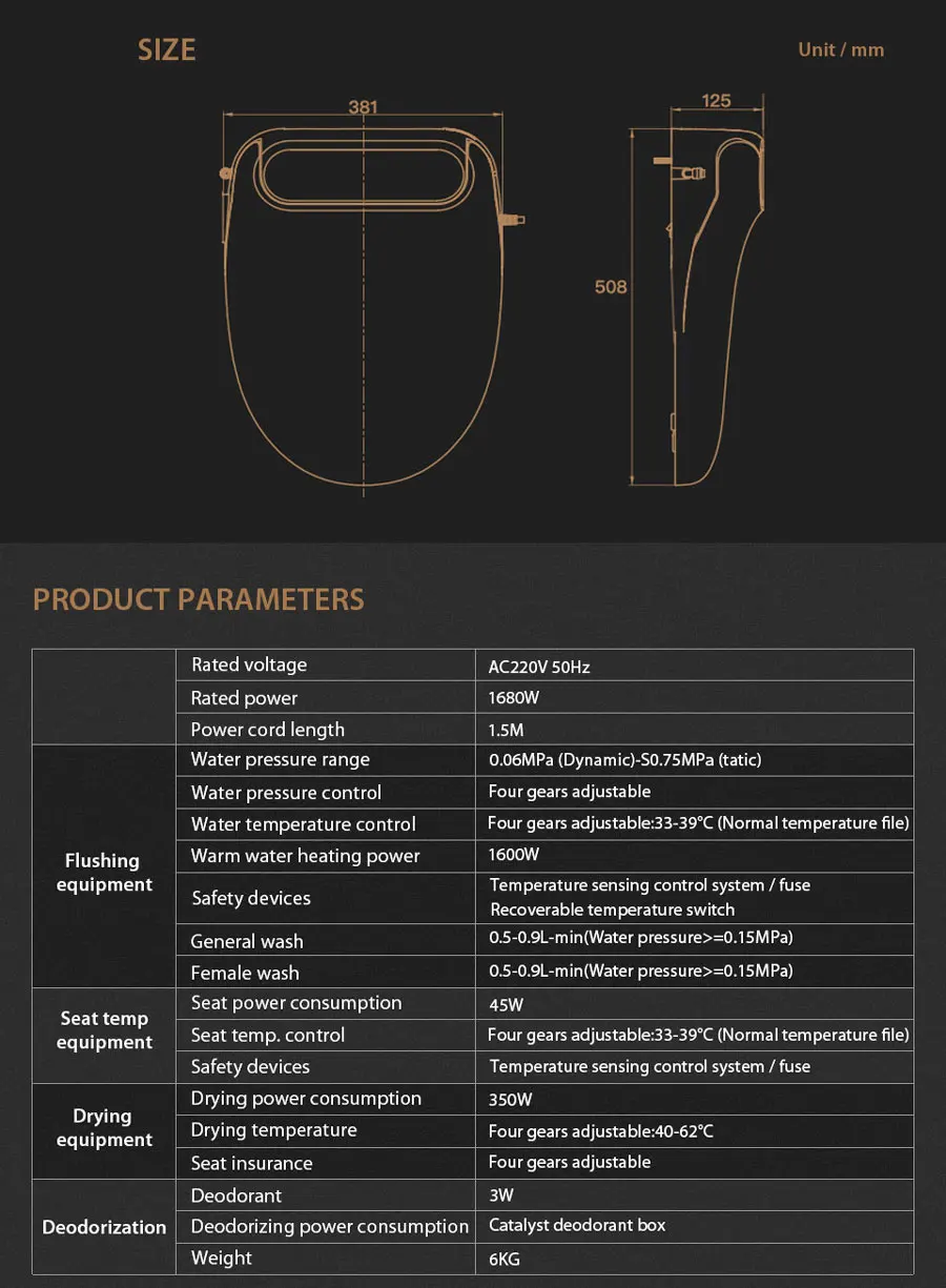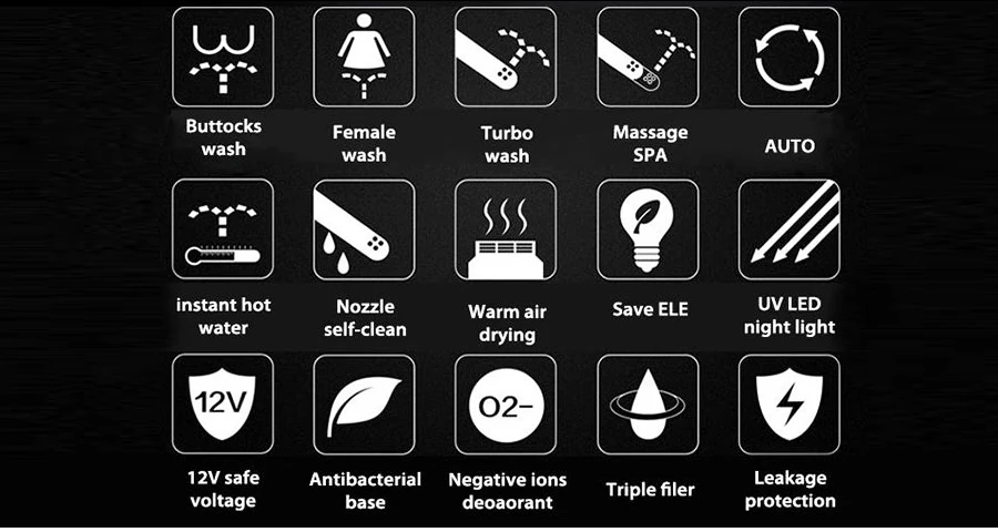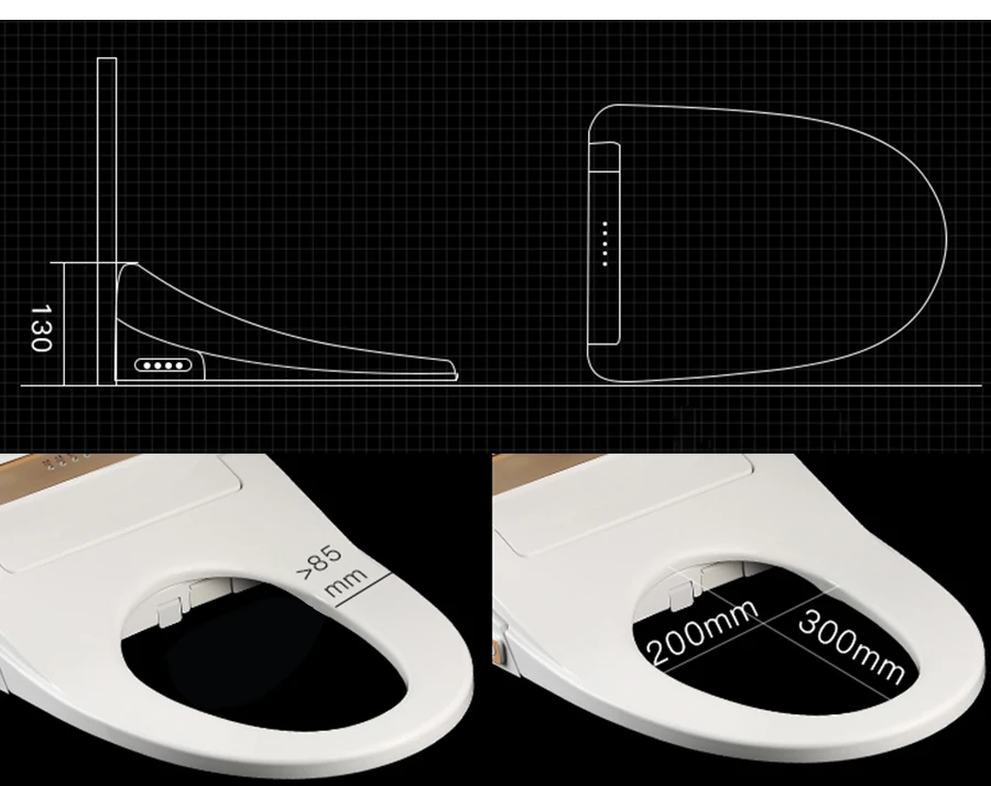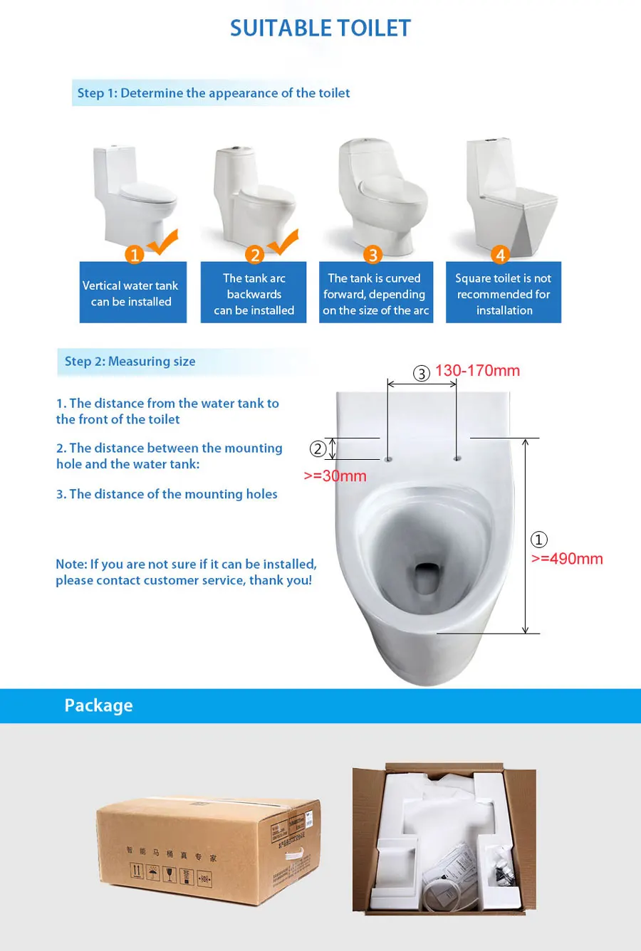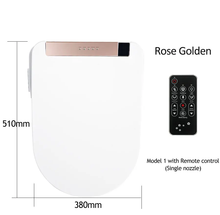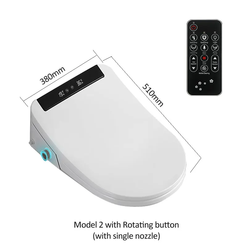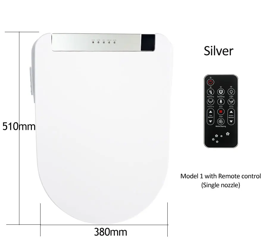 1. Four models all have these functions: hip wash, female wash, moving wash (massage), warm air drying, water temperature adjustment, drying temperature adjustment, seat temperature adjustment, water pressure adjustment, nozzle position adjustment, night light, and so on. 2. Difference: 1). model 1and model 2, model 4 are with single stainless steel nozzle. Model 3 has choice of double stainless steel nozzles and double pvc nozzle. 2). model 2 is with LCD display, but with single nozzles. 2). model 3 is with double nozzles (adding silver ion to sterilization) and LCD display, bubble washing, ceramics rod heating, temperature is more stable and washing is more comfortable. 3) model 3 has "One Key to Auto" mode and "Child Mode", "Female Mode", it is more convenient for child, woman, the old. 4). model 4 has function of automatical opening and closing cover and seat. model 1, 2,3 haven't this function. 3. all models fit U-shape toilet, not only ground installed toilet, but also wall-mounted toilet. 4.. model 3 we gift 1 filter. 5. Model 1,Model 2 and Model 4, which are shipped from China can customize can customize models with 110V and 220v-240v, and with different plug.Pipe length can be extended, if you need, please contact us.