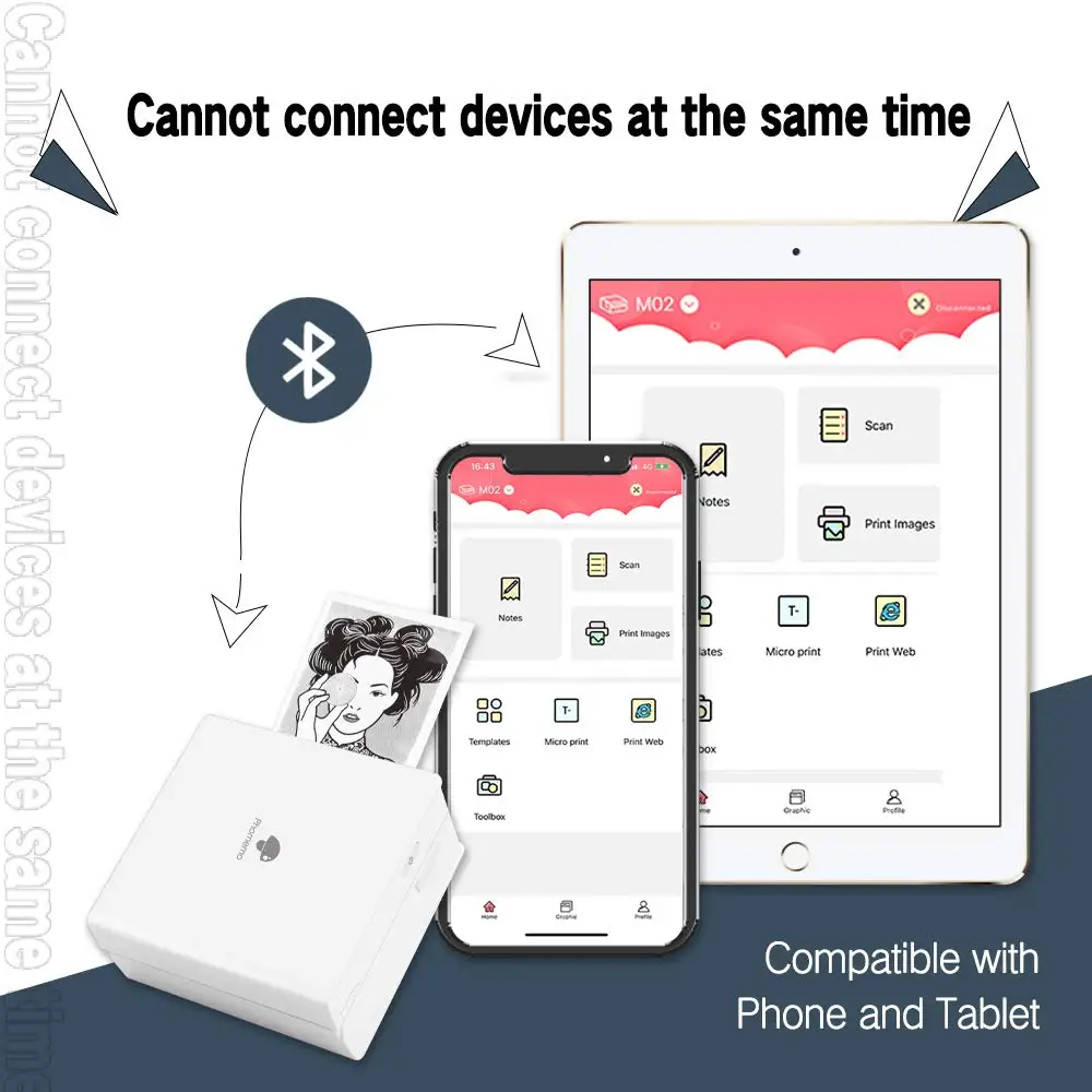 Соединение Bluetooth 4,0. Подключается к приложению Phomemo через Bluetooth, без проводов. Система: для android 4,0, Для IOS8.0 или выше.
