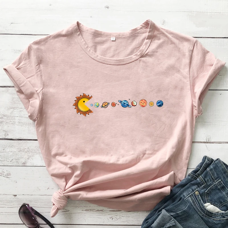Футболка женская цветная с круглым вырезом и принтом планеты