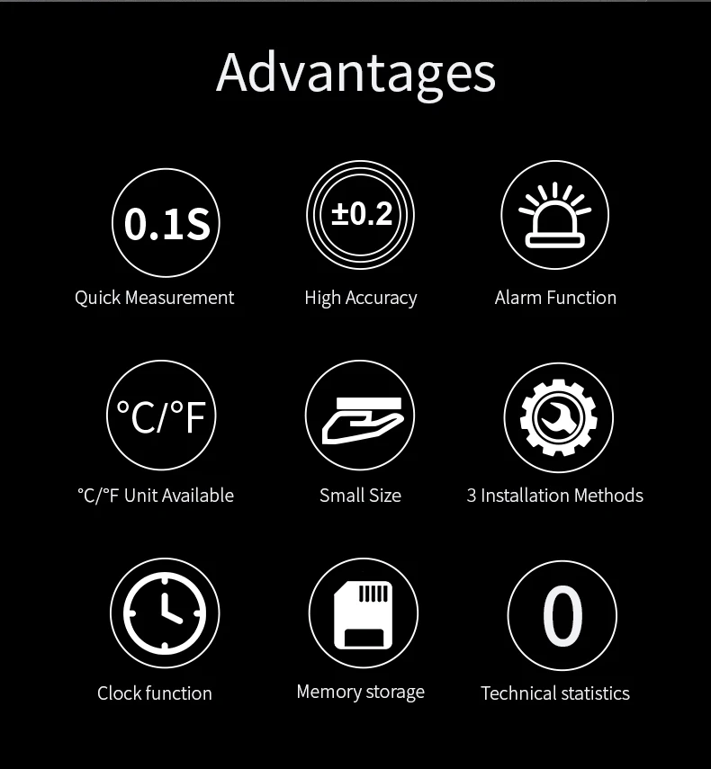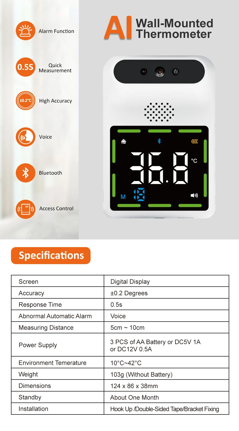 Метод измеренияБесконтактныйДиапазон измерения: режим тела (32,0 ° c-42.9 ° C) (85,9 ° f-109.2 ° f)Точность измерения: корпус (± 0,2 ° C/0,4 ° f)Разрешение: 0,1 ° C / ° fУсловия работы: 16 ° C-35 ° C (60,8 ° f-95 ° f) RH ≤ 93%Индикатор низкого напряжения ≤ 2,5 вФункция памяти: 32 группыДисплей с трехцветной подсветкой (зеленый/оранжевый/красный)Единица измерения температуры-Цельсия и ФаренгейтаФункция автоматического отключения: 20 секундРазмер внутренней коробки: 116*85*28 ммВес нетто: 120 гЦвет продукта: белыйХарактеристики продуктаБесконтактное измерение: Избегайте перекрестной инфекцииИмпортный Датчик: точность тестирования, погрешность температуры ≤ ± 0,2 ° CПредупреждение о температуре с трехцветной подсветкой: удобно для ночного измерения, более прямое предупреждение о температуреФункция памяти: может автоматически отображать последнее измеренное значение температуры и поддерживать клиническую диагностику типа теплаСигнал лихорадки: гуманная Настройка, Автоматическая сигнализация выше 38 ° CУстановка на стену: Избегайте обнаружения человека, экономьте силы