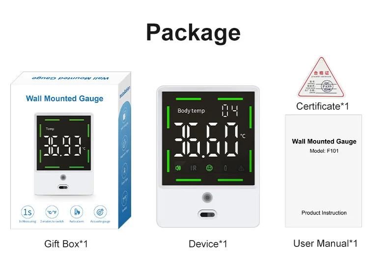 Метод измеренияБесконтактныйДиапазон измерения: режим тела (32,0 ° c-42.9 ° C) (85,9 ° f-109.2 ° f)Точность измерения: корпус (± 0,2 ° C/0,4 ° f)Разрешение: 0,1 ° C / ° fУсловия работы: 16 ° C-35 ° C (60,8 ° f-95 ° f) RH ≤ 93%Индикатор низкого напряжения ≤ 2,5 вФункция памяти: 32 группыДисплей с трехцветной подсветкой (зеленый/оранжевый/красный)Единица измерения температуры-Цельсия и ФаренгейтаФункция автоматического отключения: 20 секундРазмер внутренней коробки: 116*85*28 ммВес нетто: 120 гЦвет продукта: белыйХарактеристики продуктаБесконтактное измерение: Избегайте перекрестной инфекцииИмпортный Датчик: точность тестирования, погрешность температуры ≤ ± 0,2 ° CПредупреждение о температуре с трехцветной подсветкой: удобно для ночного измерения, более прямое предупреждение о температуреФункция памяти: может автоматически отображать последнее измеренное значение температуры и поддерживать клиническую диагностику типа теплаСигнал лихорадки: гуманная Настройка, Автоматическая сигнализация выше 38 ° CУстановка на стену: Избегайте обнаружения человека, экономьте силы