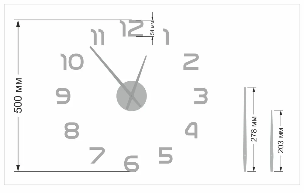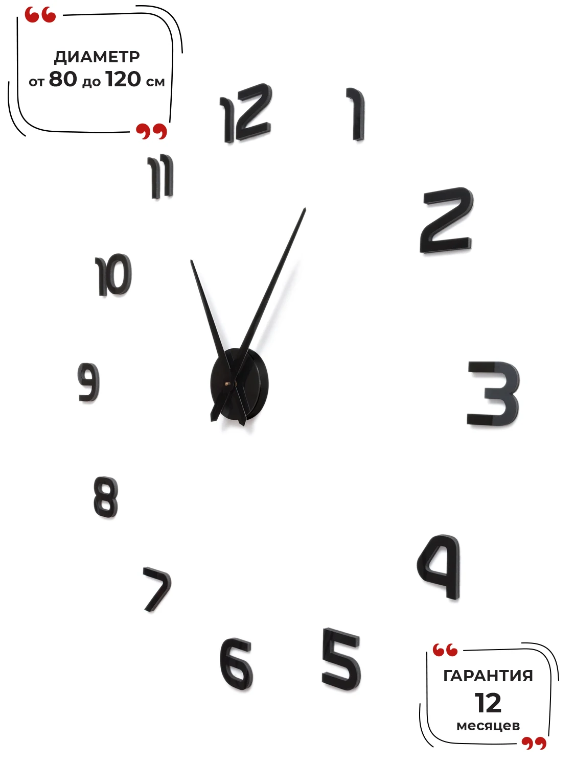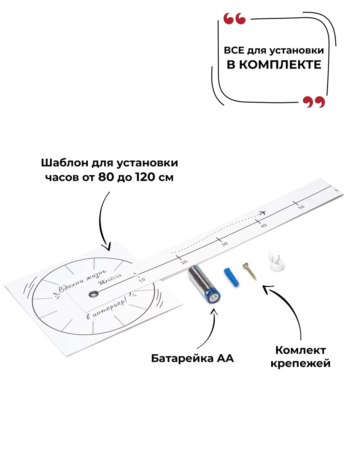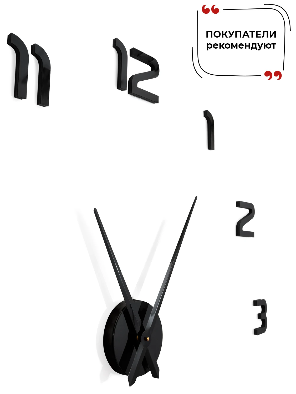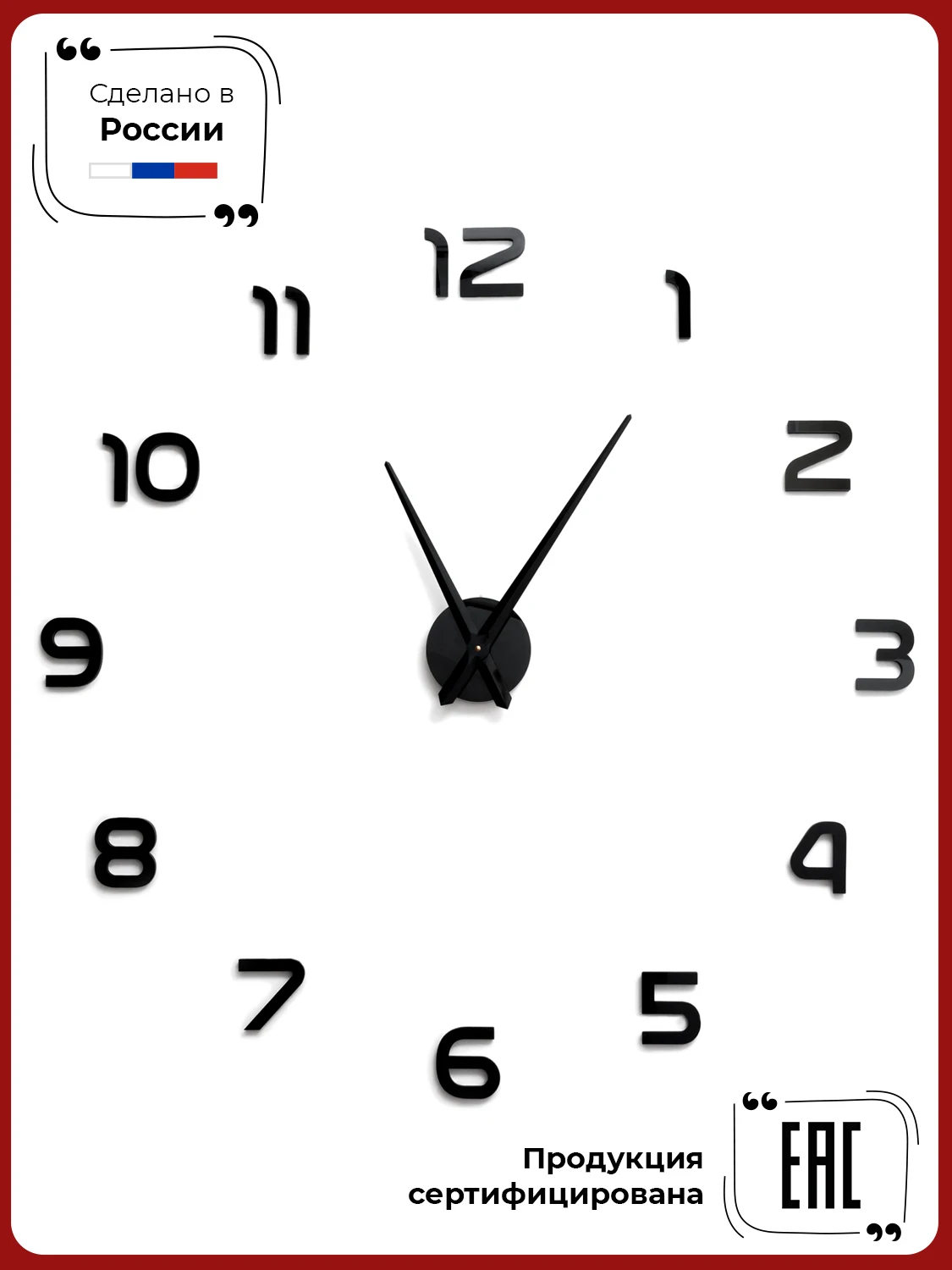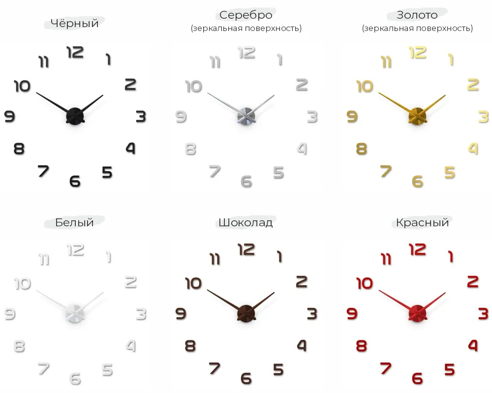 Большие 3D часы с отдельными элементами. Элементы часов изготовлены из высокоглянцевого акрилового пластика (ВНИМАНИЕ! для сохранности на элементах и чаше нанесена защитная пленка, которую необходимо снять после установки). С обратной стороны уже приклеяна вспененная основа с клеящим слоем. Вам остается только расположить часы на стене.Клеящий слой позволяет разместить часы на различные поверхности: любые виды обоев, окрашенные, деревянные, пластиковые, керамические или металлические.В комплекте к часам идет шаблон для разметки. С его помощью, Вы сами выбираете желаемый диаметр часов и делаете отметки на стене, куда будут клеиться элементы.
