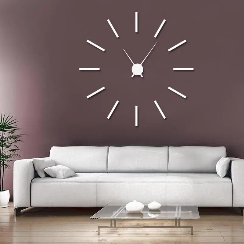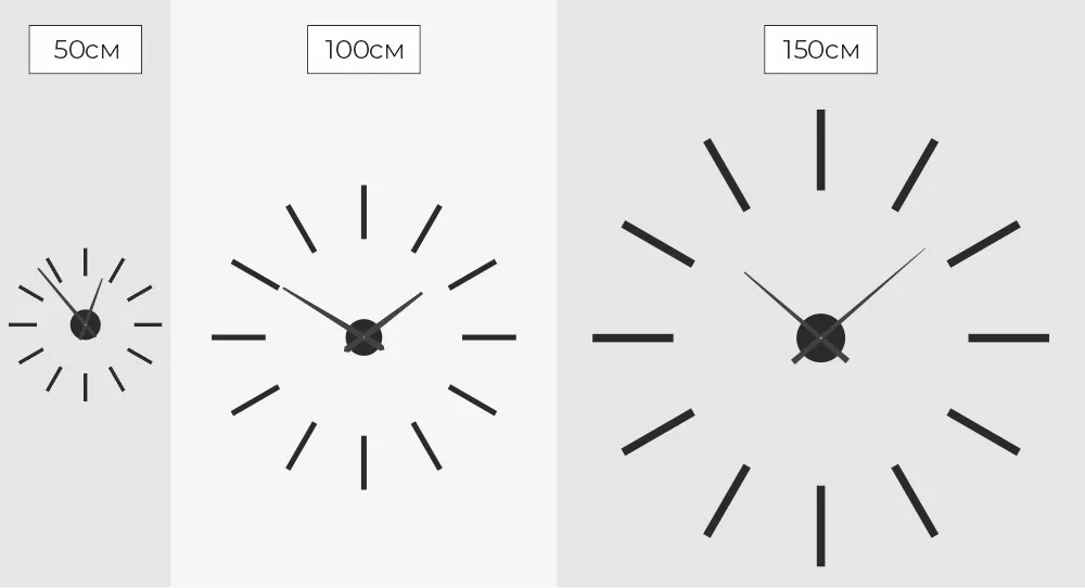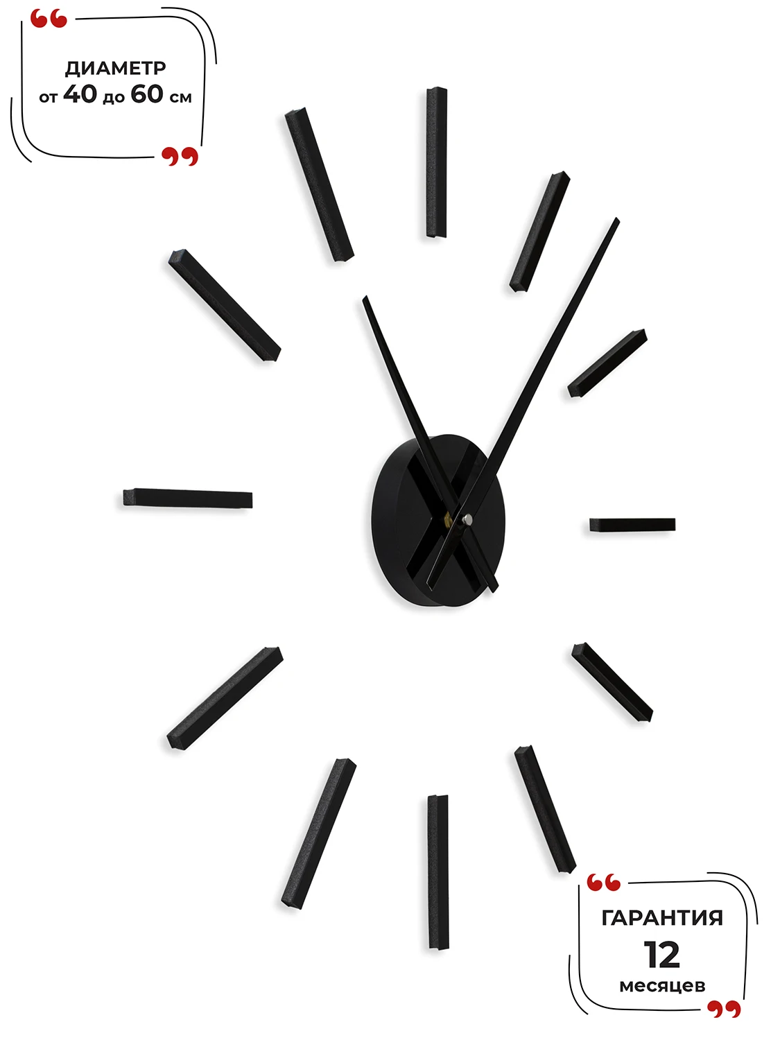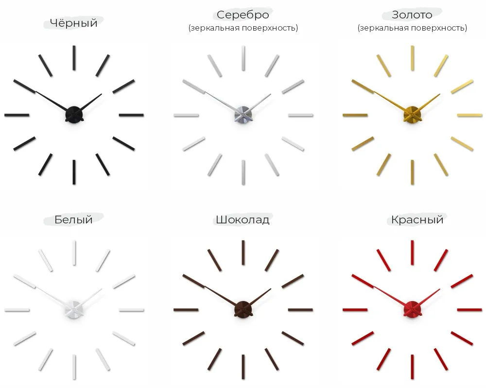 Большие 3D часы с отдельными элементами. Элементы часов изготовлены из высокоглянцевого акрилового пластика (ВНИМАНИЕ! для сохранности на элементах и чаше нанесена защитная пленка, которую необходимо снять после установки). С обратной стороны уже приклеяна вспененная основа с клеящим слоем. Вам остается только расположить часы на стене.Клеящий слой позволяет разместить часы на различные поверхности: любые виды обоев, окрашенные, деревянные, пластиковые, керамические или металлические.В комплекте к часам идет шаблон для разметки. С его помощью, Вы сами выбираете желаемый диаметр часов и делаете отметки на стене, куда будут клеиться элементы.