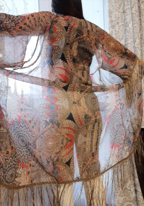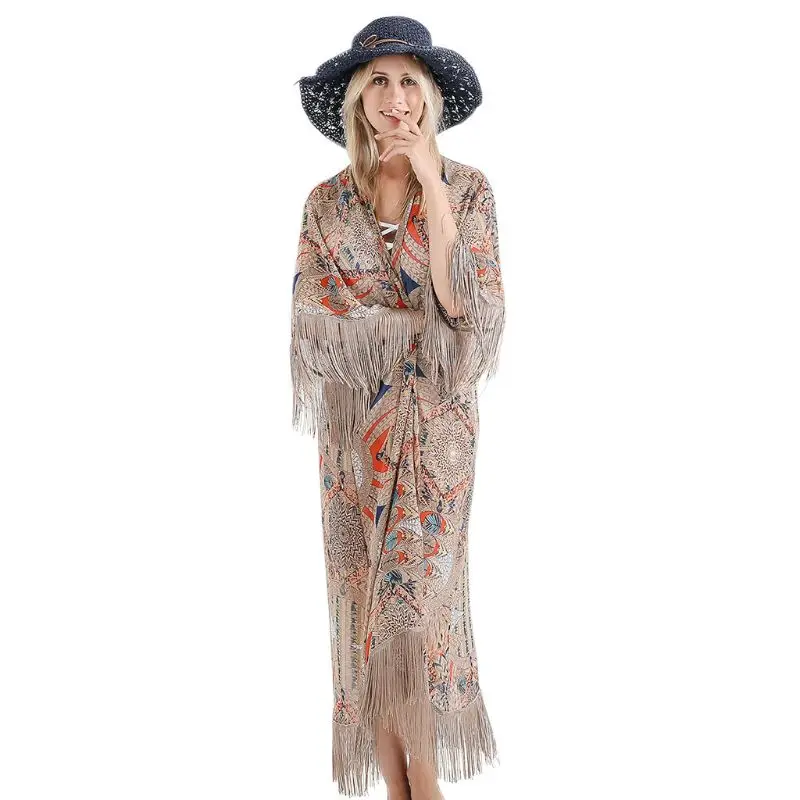 Женский шифоновый кардиган в стиле бохо, летний накидка для бикини с геометрическим принтом, бахромой и цветочным принтом, в стиле ретро