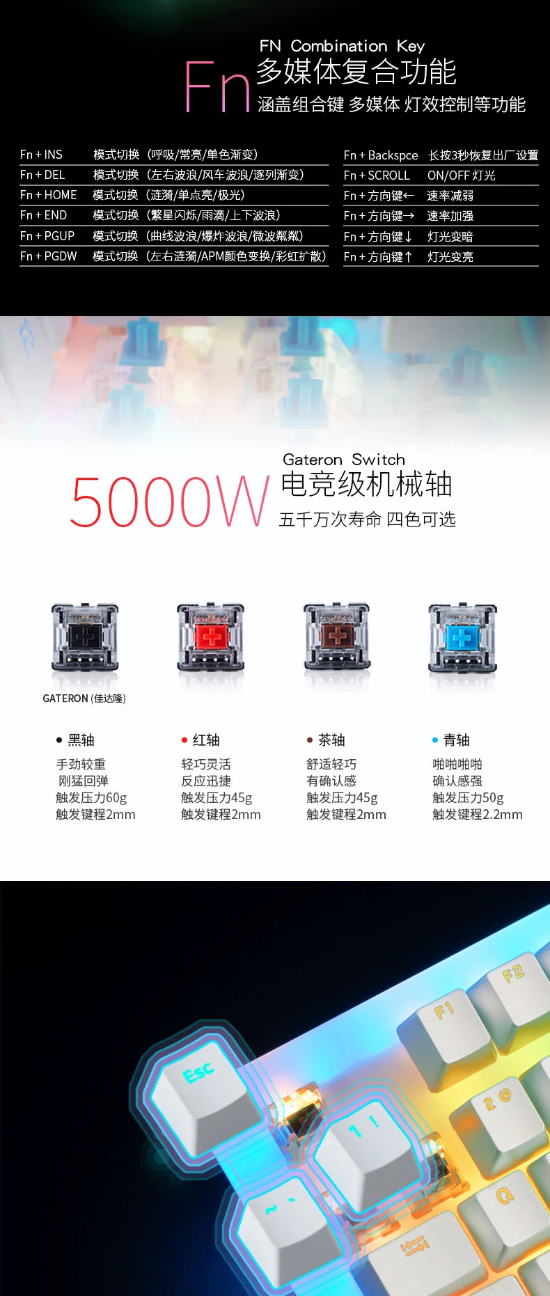 Очень классная клавиатура, решил купить для рабочих задач, поэтому попробовал кликающие переключатели (они мне очень понравились), был приятно удивлен качеством: акрил обработан превосходно, приятный на ощупь - матовый; стоковые колпачки хорошие, без заусенцев; подсветка имеет достаточно уровней яркости и много интересных режимов (очень понравились срабатывающие при нажатии), цветовая палитра по умолчанию показалась необычной, но приятной и свежей по сравнению с моей другой клавиатурой, также есть фирменное ПО (простое, но функциональное); стабилизаторы очень порадовали (мне показалось, что они смазанные), они тихие и хорошо стабилизируют, хотя их легко довести до идеального состояния в случае чего. Hot-swap это вообще круто, в любой момент можно заменить переключатели. Доставили быстро, без повреждений. По-моему, это лучшее место для покупки, так как продавец лучший из всех, с кем я пока имел дело на aliexpress, решает любые в том числе и заводские проблемы.