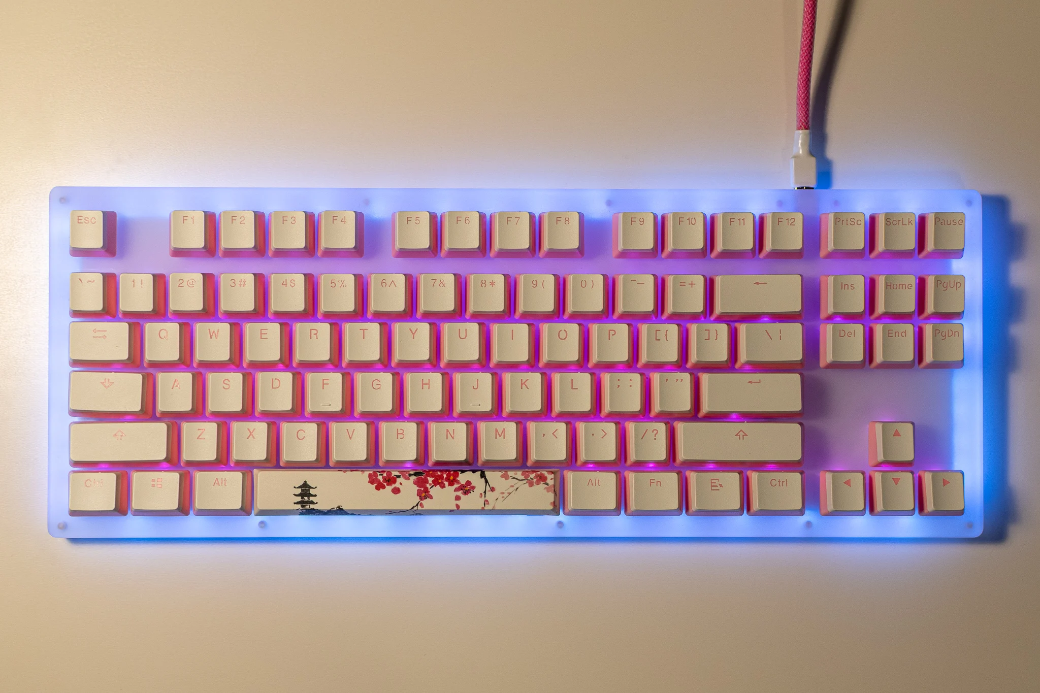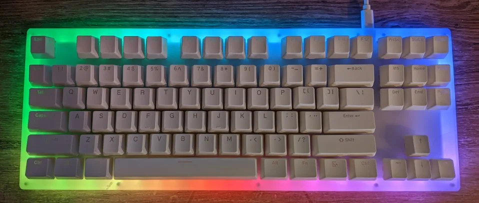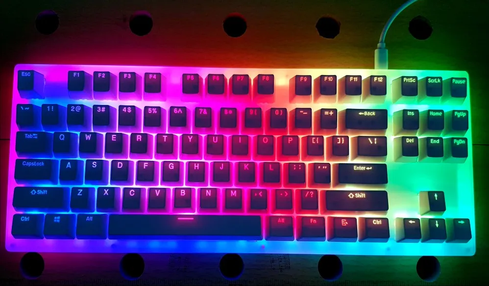 Клавиатура поставляется точно так, как ожидалось, с приличным белым блеском через OEM keycaps. RGB отлично подходит, и акриловый чехол хорошо подходит. Мне нужно было найти программное обеспечение для этой клавиатуры с reddit post, но там все было хорошо программировать RGB, а также макросы. Стабилизаторы в наличии, однако, безусловно, являются худшими из тех, которые я когда-либо использовал на клавиатуре, в основном распутываются и крепятся довольно свободно на пластине. Это может быть оправлено, так как эта плата, как правило, модульная, это то, что я сделал. После обрезания, обрыва и ленточной поддержки стопок я вполне доволен. Изображен на заказ с брелоками и кабелем.