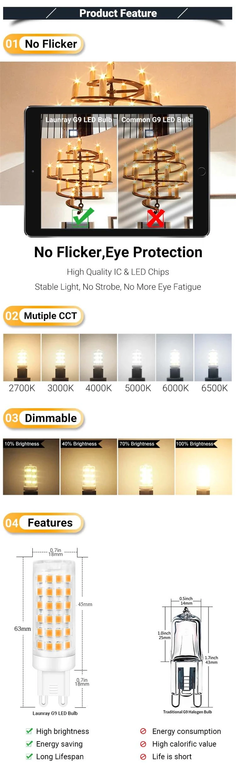 Экономит более 90% электроэнергии. Супер длительный службный срок службы до 50000 часов. Тщательно решить вашу проблему частого замены ламп. Международный стандарт G9 основание, подходит для всех G9 светильник. Экологически чистый, не содержит токсичных веществ, не содержит ртути, не содержит УФ-или инфракрасного излучения. Больше защиты ваших глаз