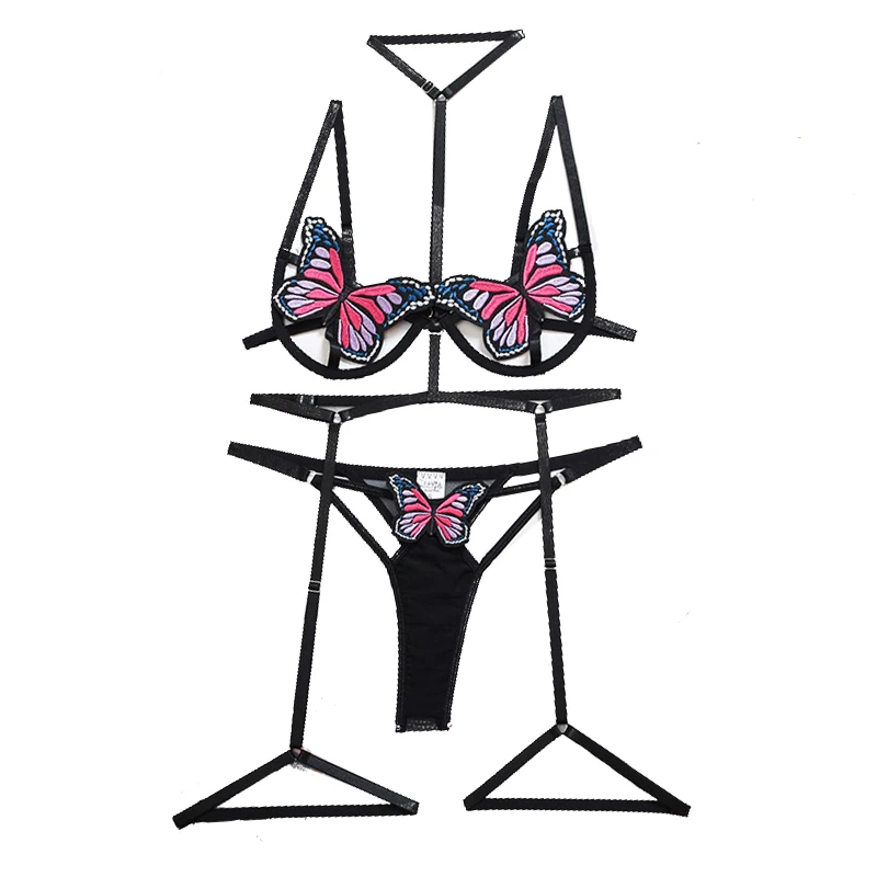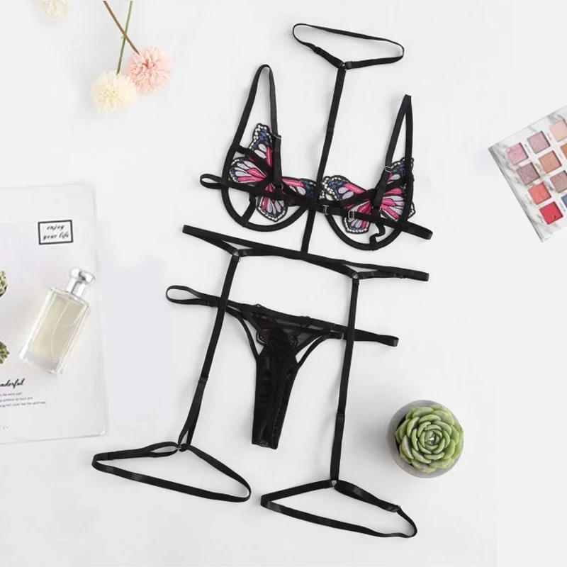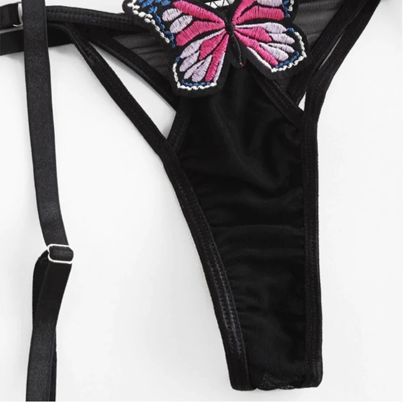 Комплект нижнего белья женский, с подвязками, с аппликацией в виде бабочек