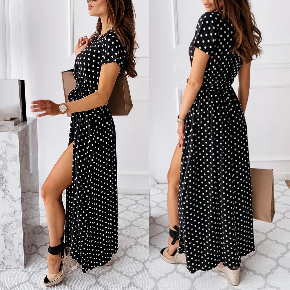 Женское платье с запахом, Летнее Длинное Платье с V-образным вырезом, коротким рукавом, поясом и принтом в горошек, с разрезом спереди, 2020