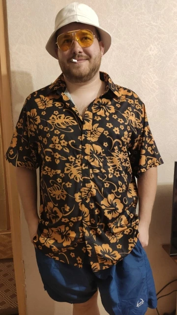 Рубашка по принту совпадает . С покроем можно ещё поспорить но вот материал из которого она сделана оставляет желать лучшего , видимо самая дешевая синтетика . По факту никакая это не гавайская рубашка , которая была на герое фильма . А синтетическая шняга , натуральных материалов в ней ноль , точно так же как и комфорта в жаркую погоду.