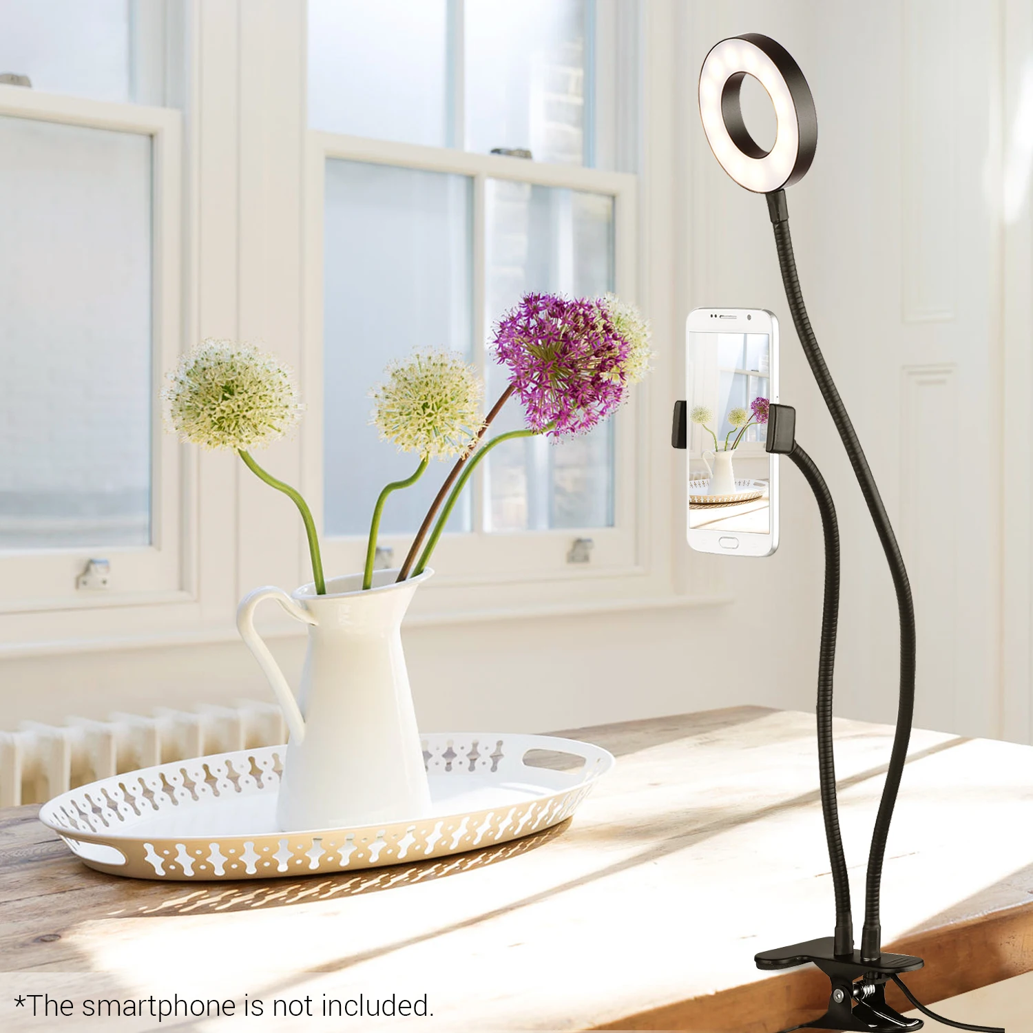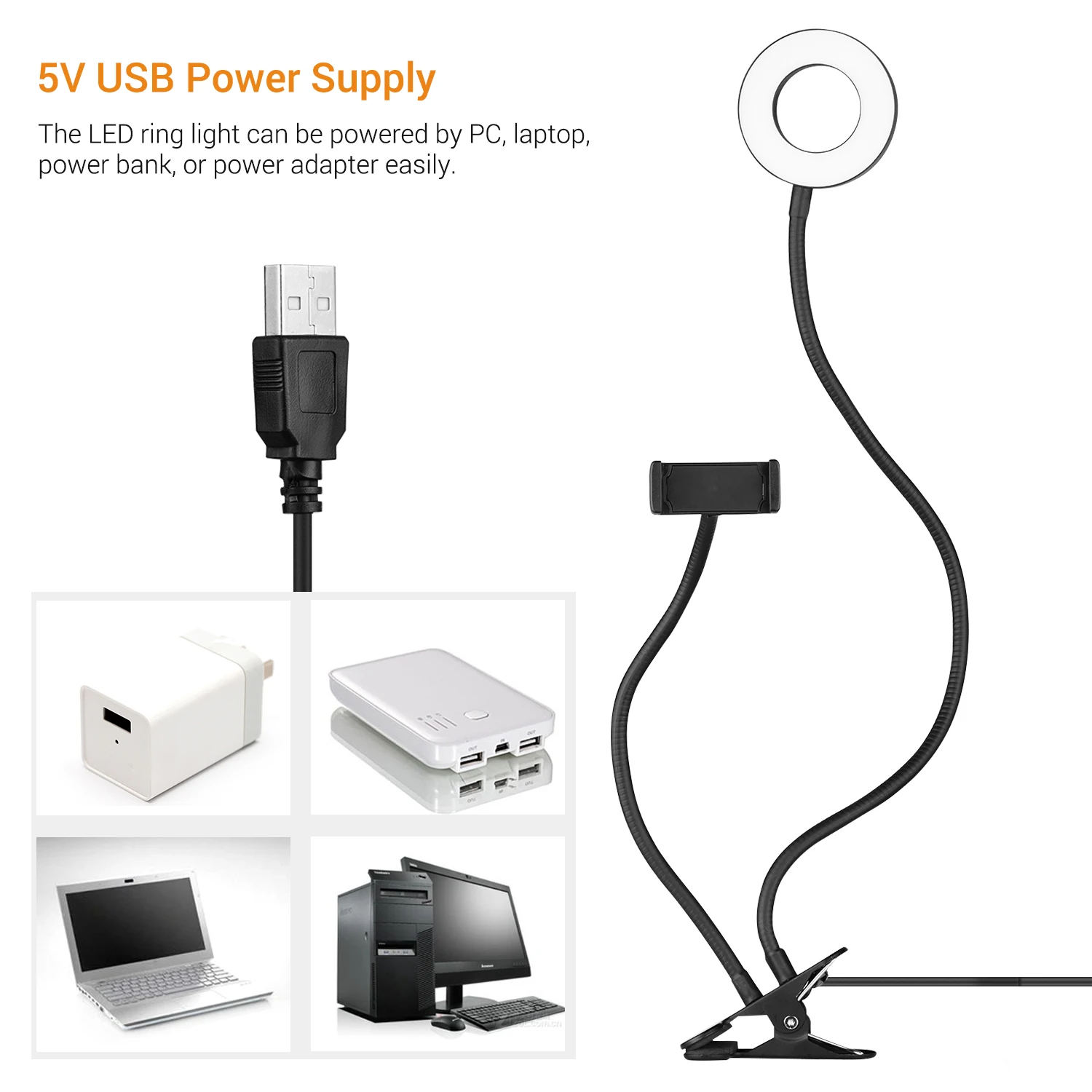 Гибкие ручки и прочный зажим:Гибкая конструкция руки, вы можете регулировать угол использования кольцевого света и смартфона свободно; Прочный металлический зажим позволяет вам фиксировать кронштейн на столе стабильно.