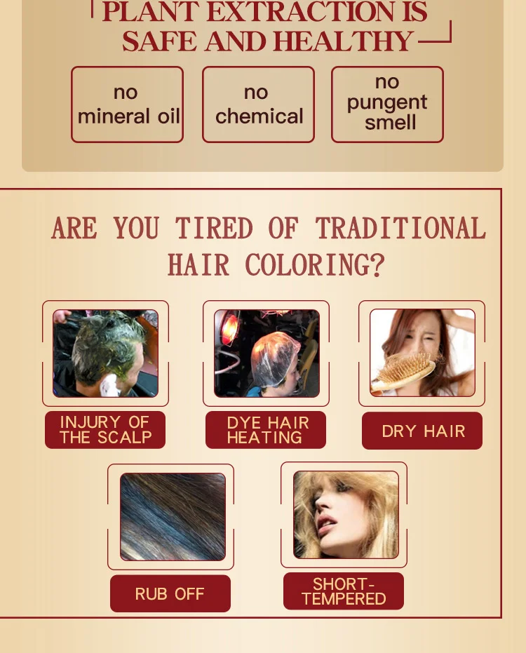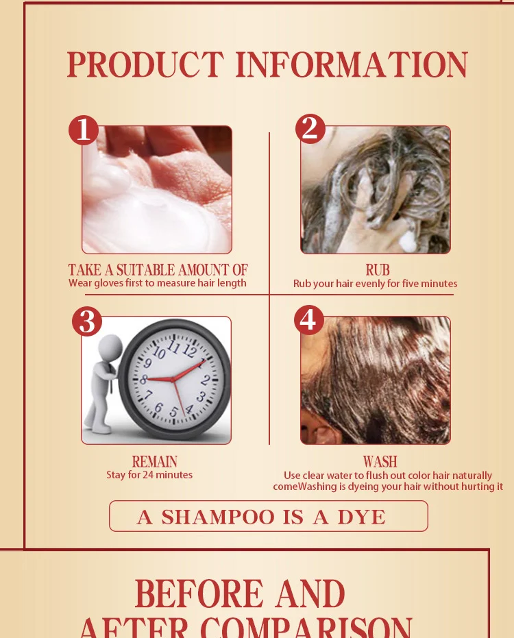 УдобныйПростота в эксплуатации: наденьте перчатки и отожмите шампунь, потрите в течение нескольких минут, как при использовании обычного шампуня.2. Экономия времениИспользуйте только один раз, чтобы придать черным блестящим волосам за 5-25 минут.3. Экономия средствПо сравнению с дорогой стоимостью окрашивания волос в парикмахерской, шампунь для черных волос более чем в 10 раз дешевле.4. Натуральный и мягкийЧерный Волшебный Шампунь натуральные волосы с аргановым маслом, высококачественный продукт по уходу за волосами в формуле натуральной роскоши, не будет никакого вреда для ваших волос и кожи головы, когда они придадут вам черные и сияющие волосы.
