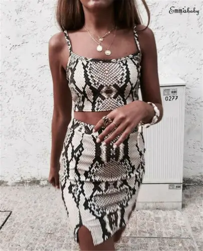 Женский комплект из двух предметов, элегантный бандажный укороченный топ без рукавов и юбка со змеиным принтом, Клубная вечерние, комплект из двух предметов, уличная одежда для девочек на лето