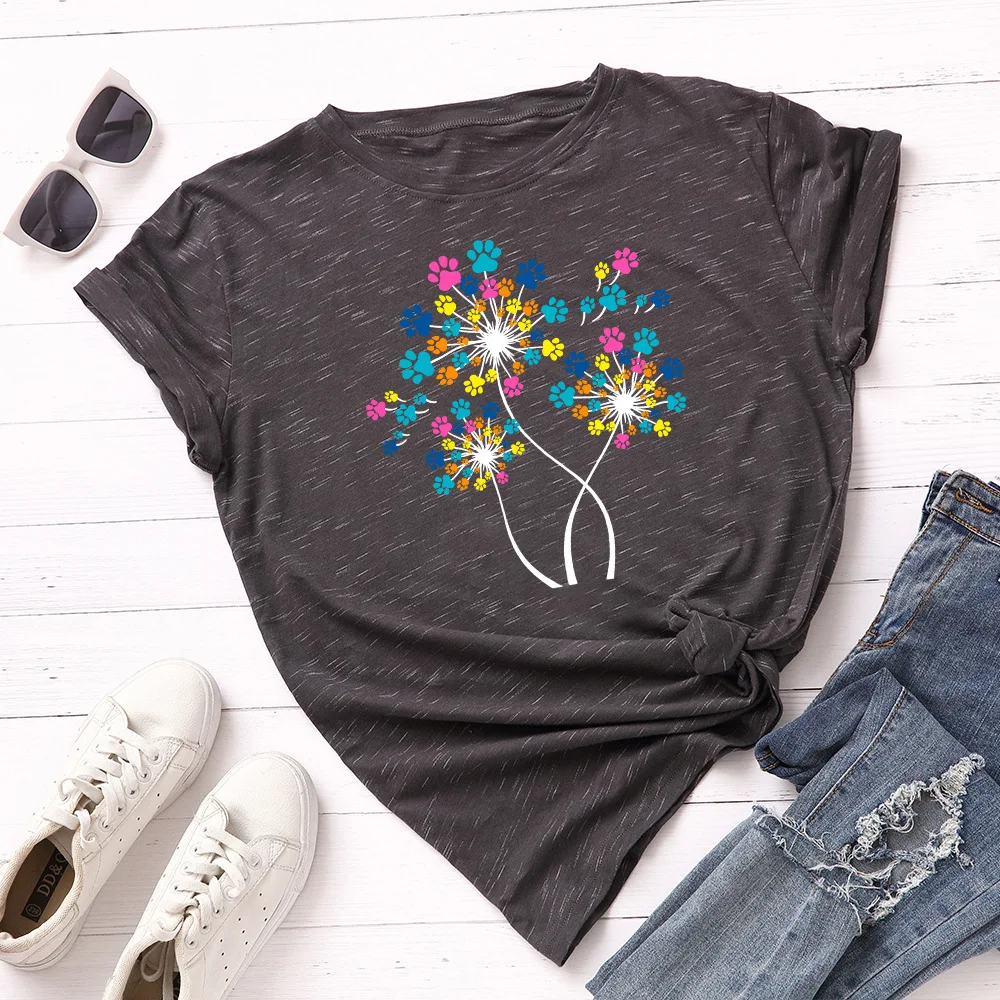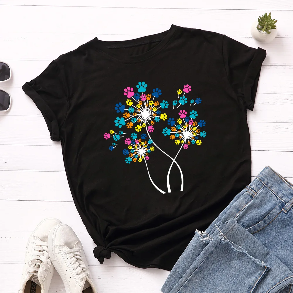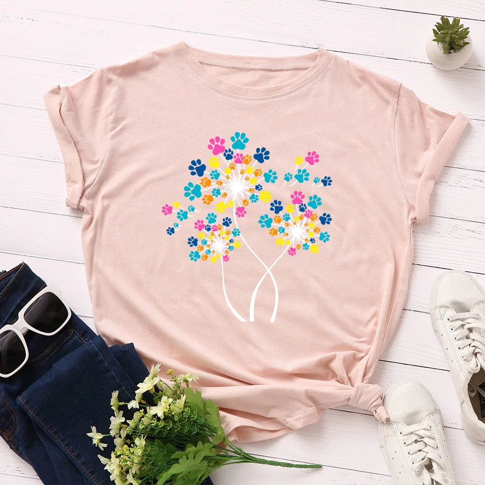 Женская футболка из хлопка, с принтом одуванчиков, в стиле Харадзюку, с изображением собачьих лап большого размера, лето 2020, свободная футболка