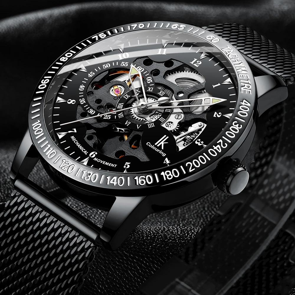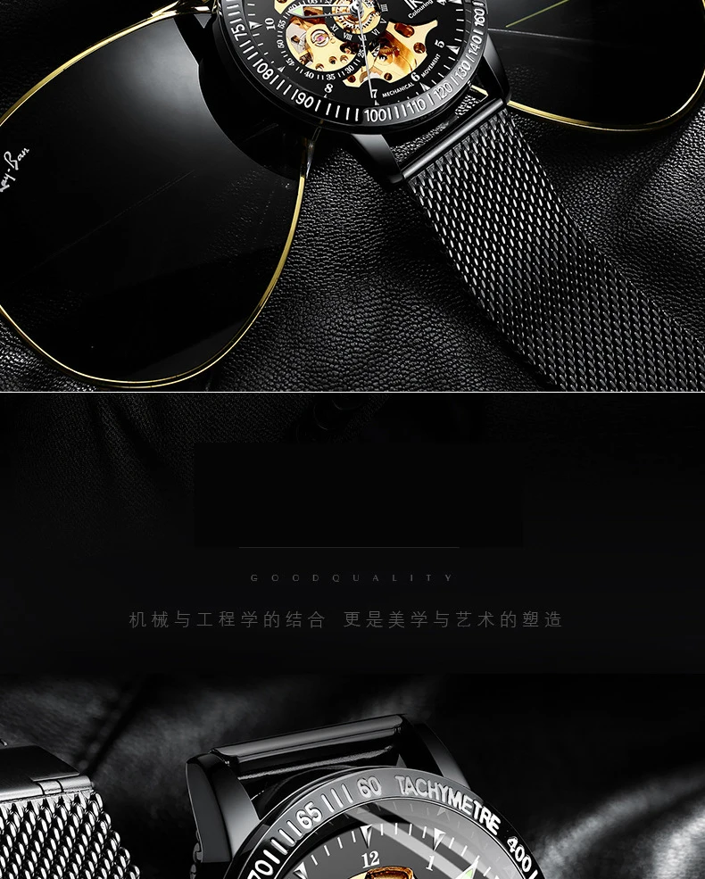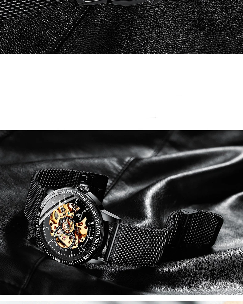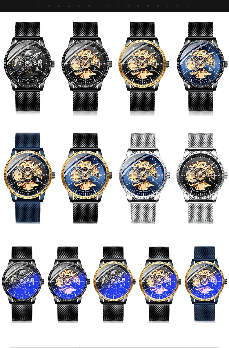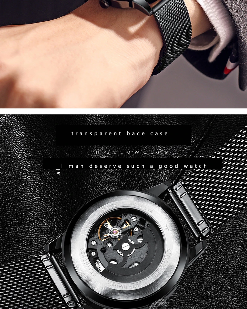 Распродажа купонов, мужские часы, сетчатый Браслет из нержавеющей стали, автоматические механические мужские часы-скелетоны, мужские наручные часы, мужские часы